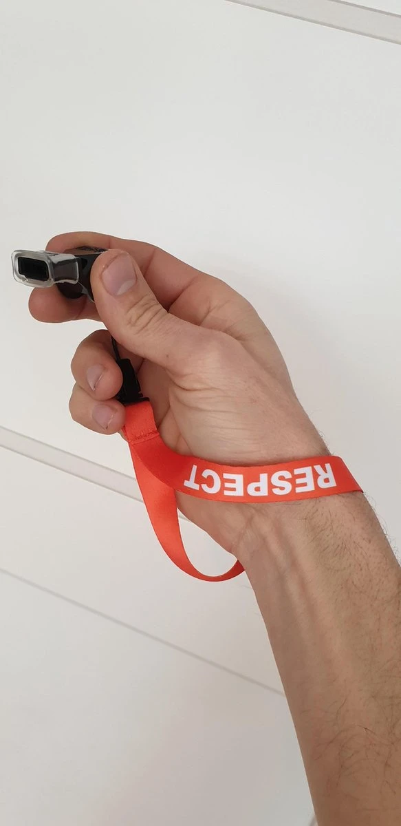 In plaats van de lange, niet bruikbare nekkoorden, een uiterst handige polsband in Oranje met opdruk RESPECT zoals een ieder dat voor de scheidsrechter dient te tonen.