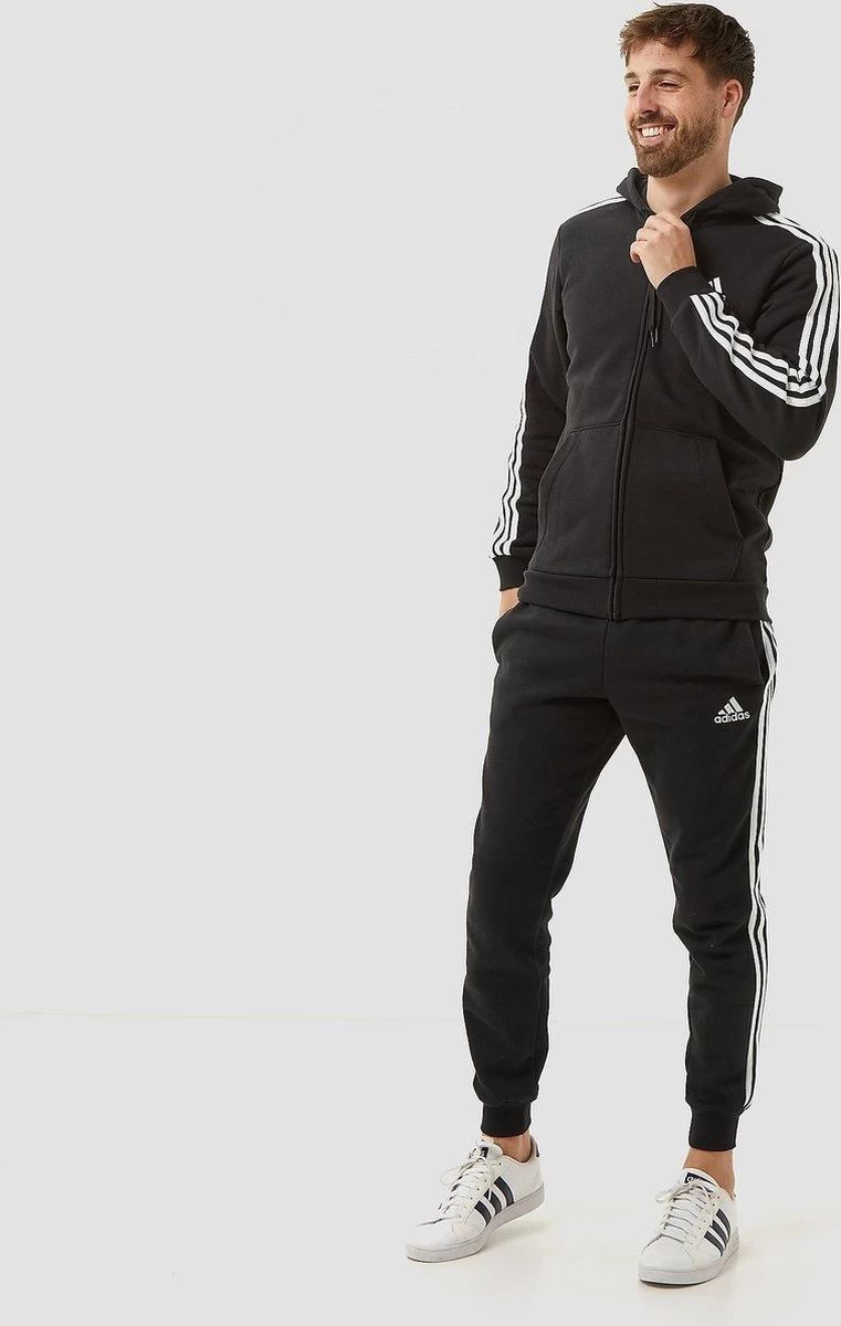 De zwarte Essentials 3-Stripes Tricot trainingsbroek voor heren is supercomfortabel en staat ook nog eens goed bij je sportieve outfit. De elastische tailleband houdt de broek op zijn plek en voorkomt opkruipen en afzakken. Voorzien van open zakken.
