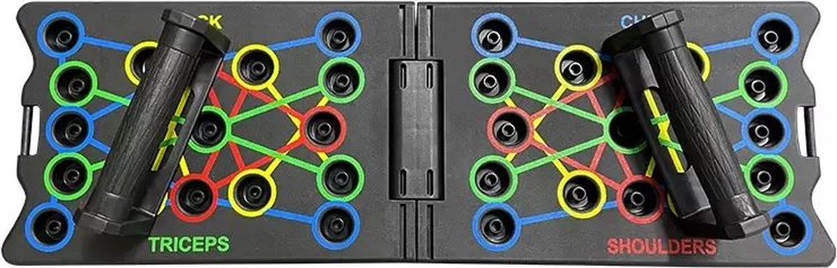 Met het Push up Bord XL kan je meerdere spiergroepen trainen door de handvaten elke keer anders te positioneren. De kleuren op het bord vertegenwoordigen elk een andere spiergroep. (Zie afbeelding)