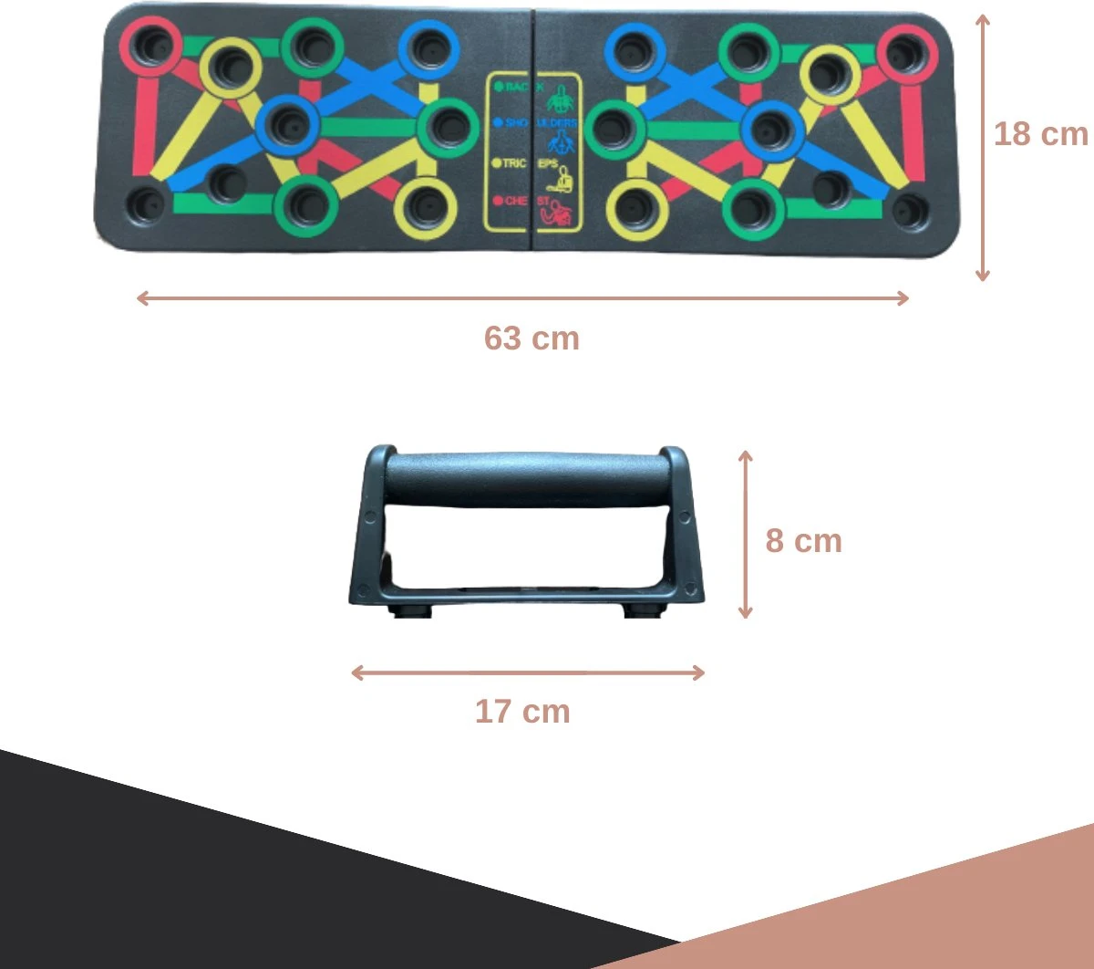 Het push up bord heeft 14 verschillende standen, door je handen in een andere positie te houden benadruk je ook andere spiergroepen. Door je handen bijvoorbeeld dichter bij elkaar te doen leg je meer nadruk op je tricep, die zit aan de achterkant van je bovenarm. Als je je handen wat verder uitelkaar te zet leg je wat meer nadruk op je borst, zo kun je variëren tijdens je training en verschillende spiergroepen trainen met één oefening!