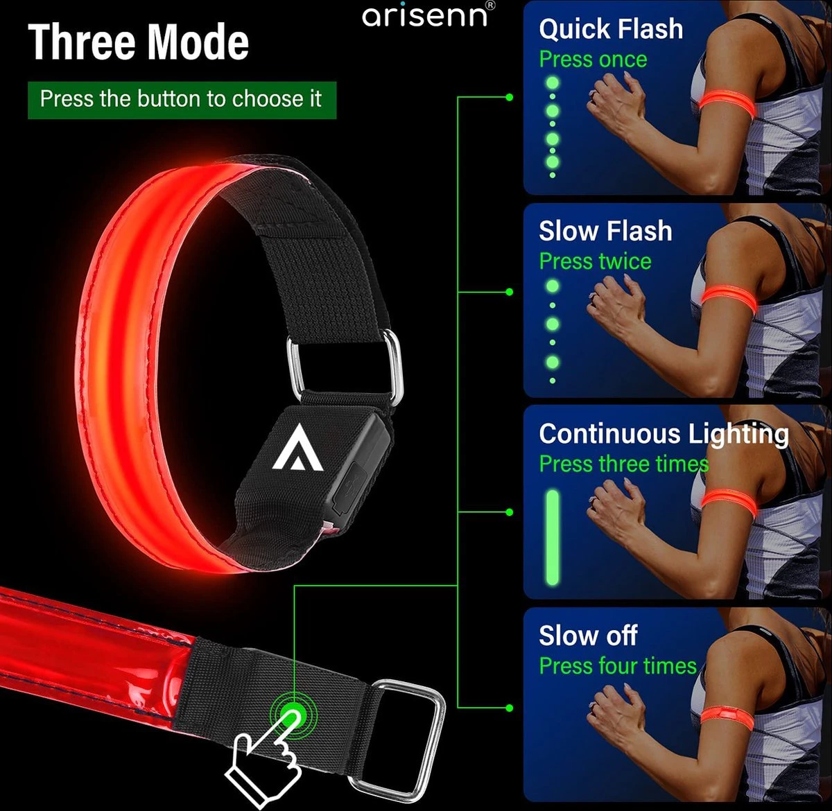Val op in het donker met de Led lightning bands van Arisenn. De Led lightning bands van Arisenn zorgen voor extra veiligheid, zodat je ook tijdens de late avonduren of vroege ochtend uren veiligen kunt gaan hardlopen, fietsen, joggen, skeeleren of gewoon tijden het wandelen. Ook voor outdoor wandelingen met uw hond is dit een Must! De lightning bands van Arisenn kan je gemakklijk op je arm, been of aan je fiets bevestigen. Ze zijn lichtgewicht, dus tijdens het wandelen, skeerlen of hardlopen merk je niet dat je hem om hebt. De led lightning bands heeft 3 standen, ook zit er een usb kabel bij. Even opladen en je kan naar buiten.