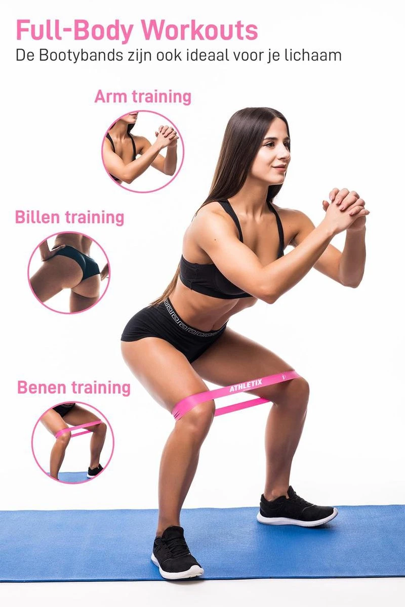 De bootybands zijn niet alleen om je billen te trainen maar ook je heup-, been-, arm- en buikspieren. Binnen 15 minuten kan jij een volledige workout achter de rug hebben. Een alles in een oplossing.