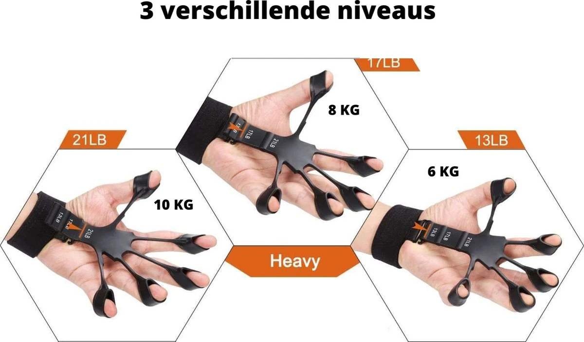 De vingertrainer is ontworpen om je handspieren, vingers en polsen optimaal te trainen. Het compacte en lichtgewicht ontwerp maakt het gemakkelijk vast te pakken en te controleren. Bovendien biedt het 3 niveaus van weerstandsbanden die je kunt aanpassen aan je eigen gripsterkte.