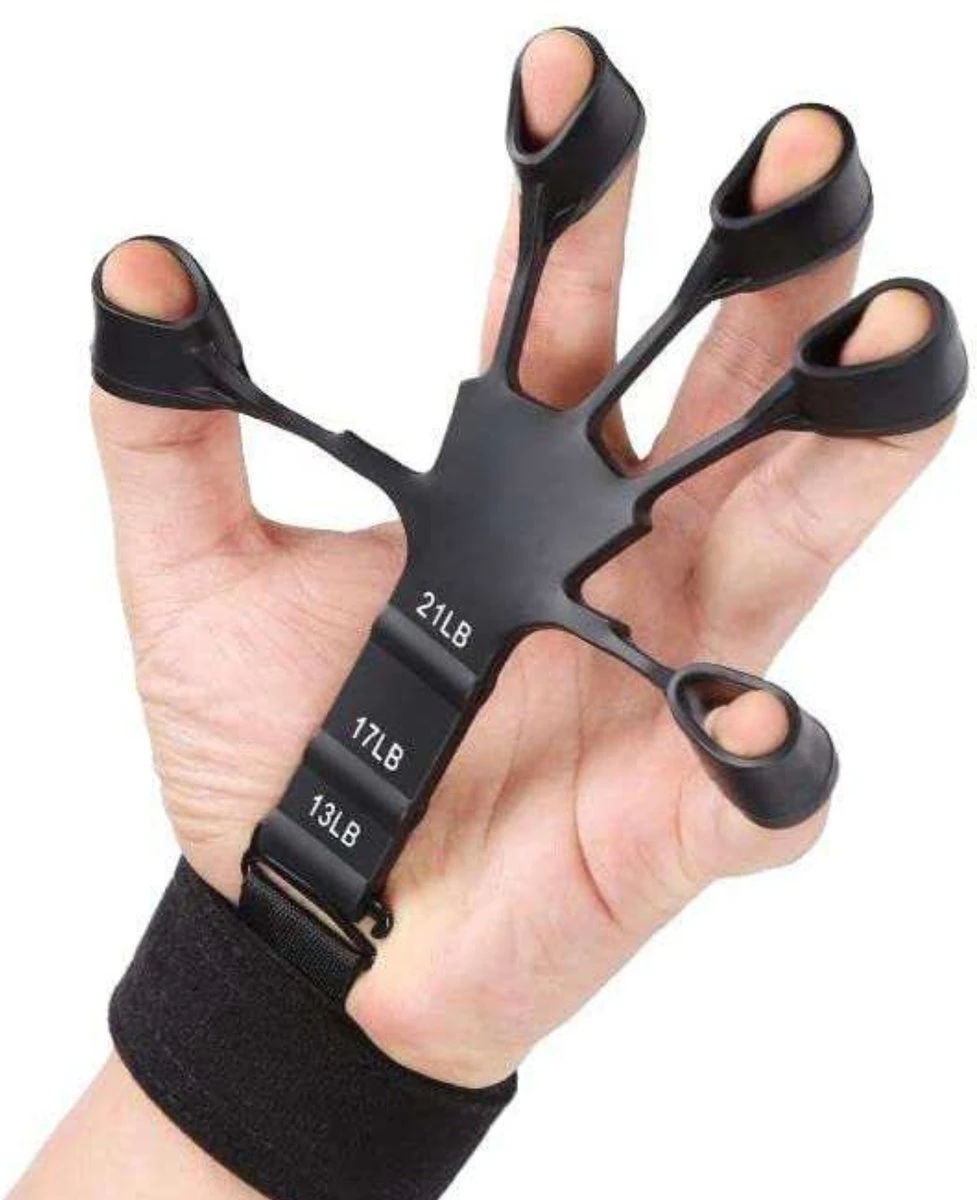 • Knijpoefening: Plaats de Vinger Gripper tussen je vingers en knijp in de band om je gripkracht te trainen.