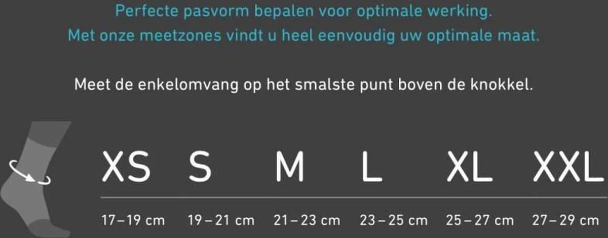 Maat Enkelomvang XS 17 – 19 cmS 19 – 21 cmM 21 – 23 cmL 23 – 25 cmXL 25 – 27 cmXXL 27 – 29 cm