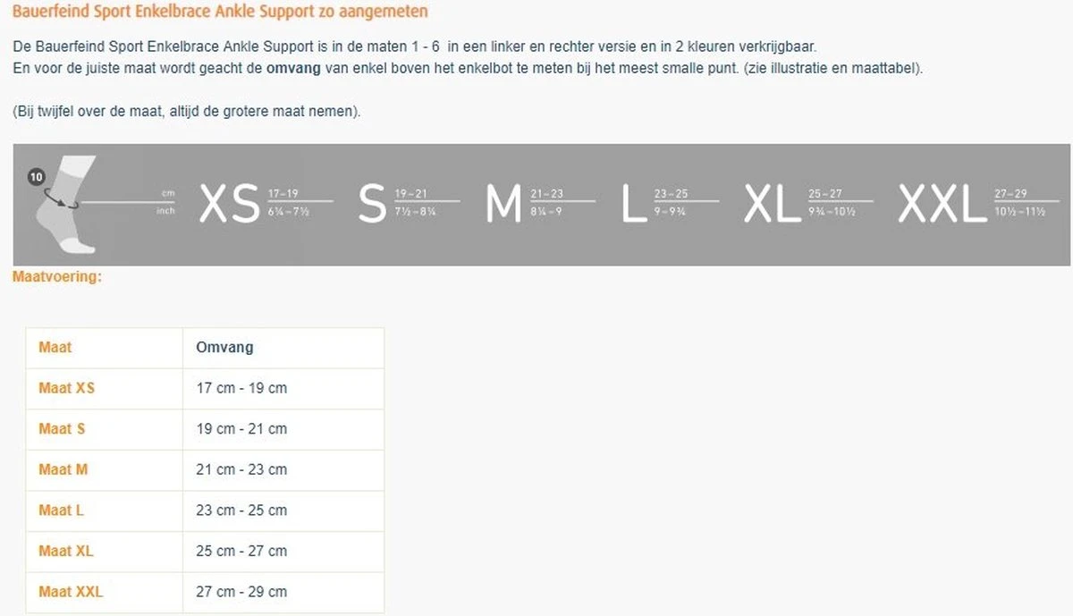 Om de Bauerfeind Sports Ankle Support optimaal te benutten is de maatvoering erg belangrijk. Om de juiste maat te kiezen dient u de enkelomvang te meten (zie bovenstaande afbeelding). Vervolgens kunt u in onderstaande tabel de juiste maat kiezen.