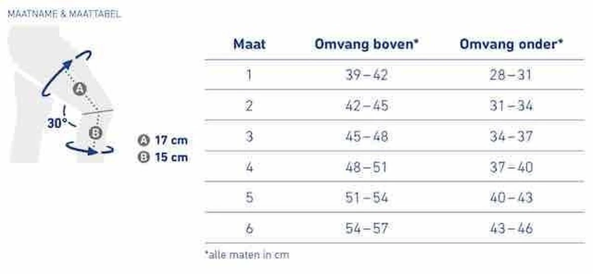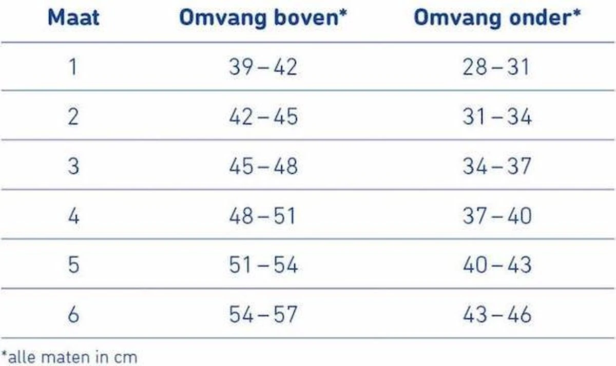 Maat Enkelomvang XS 17 – 19 cm S 19 – 21 cm M 21 – 23 cm L 23 – 25 cm XL 25 – 27 cm XXL 27 – 29 cm