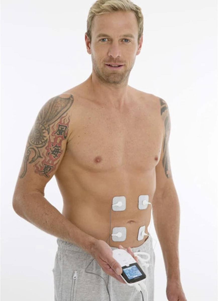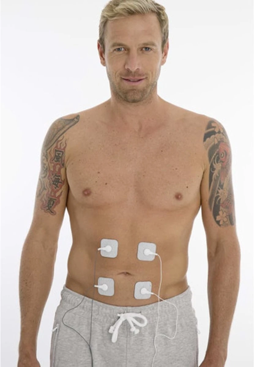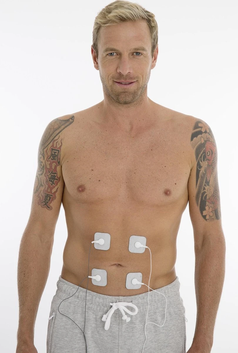 – Twee afzonderlijk instelbare kanalen met vier zelfklevende elektroden (45 x 45 mm)