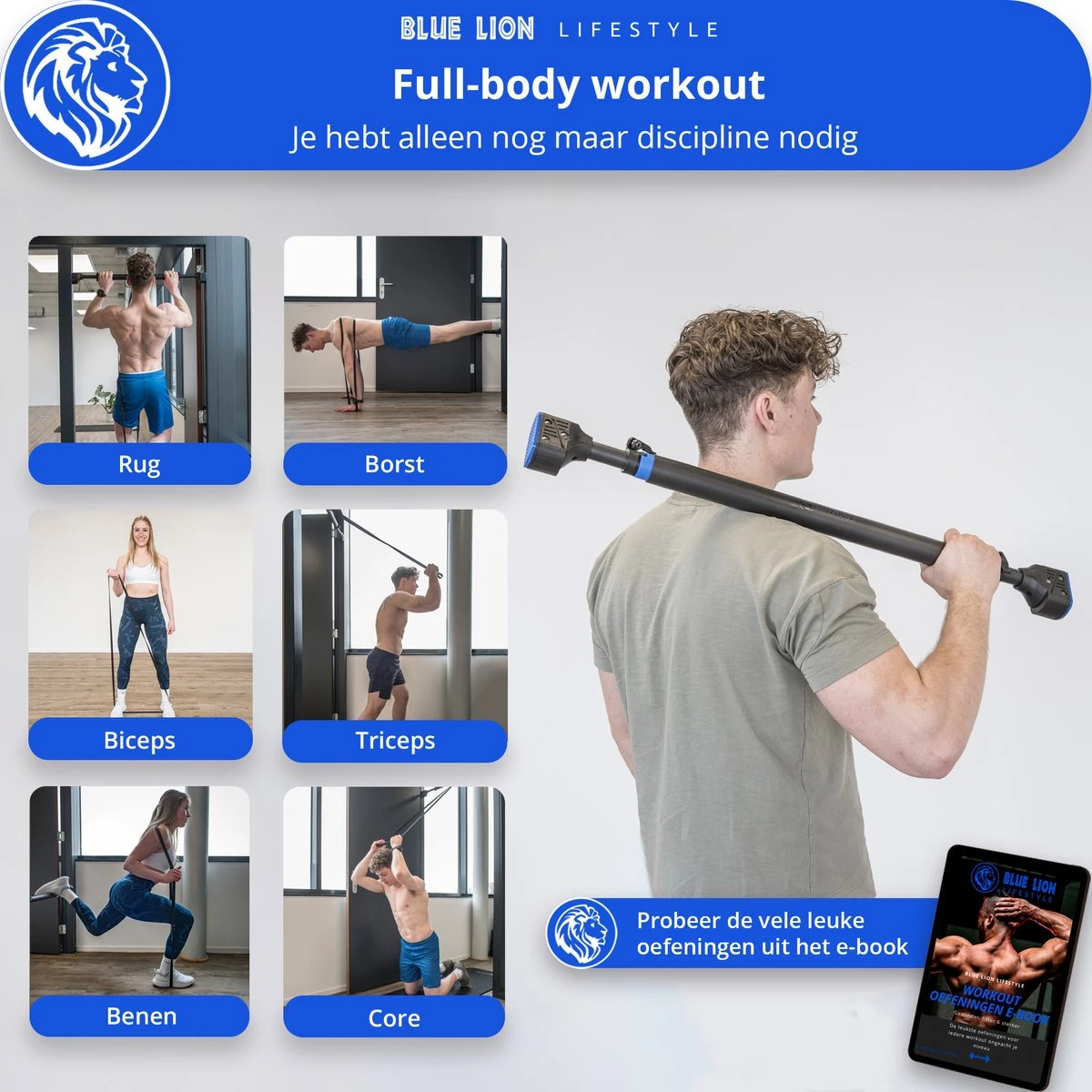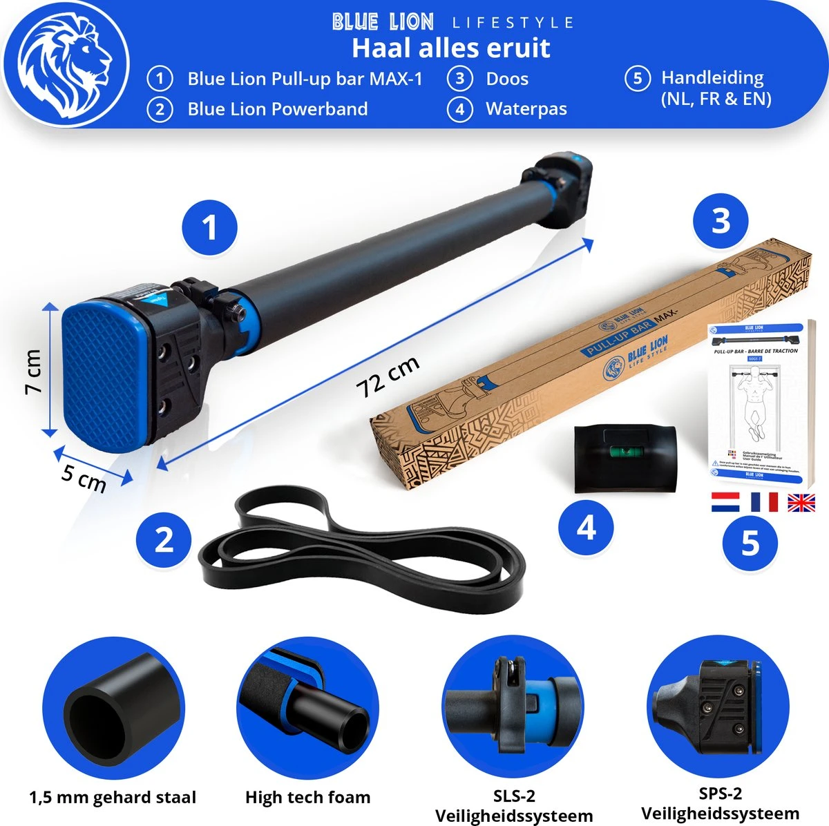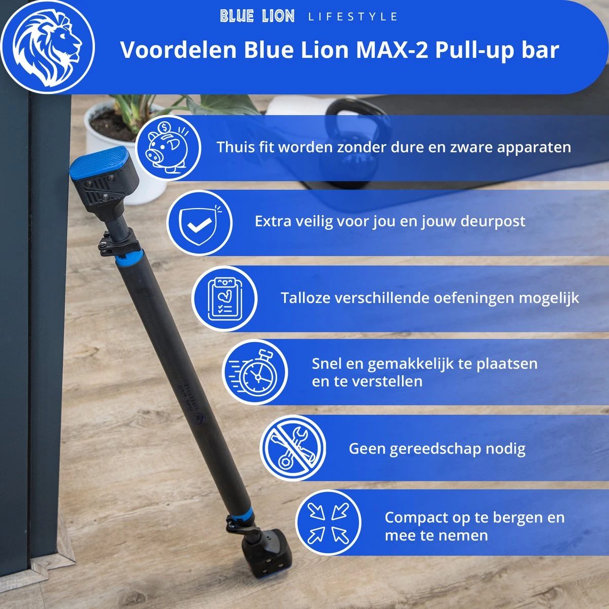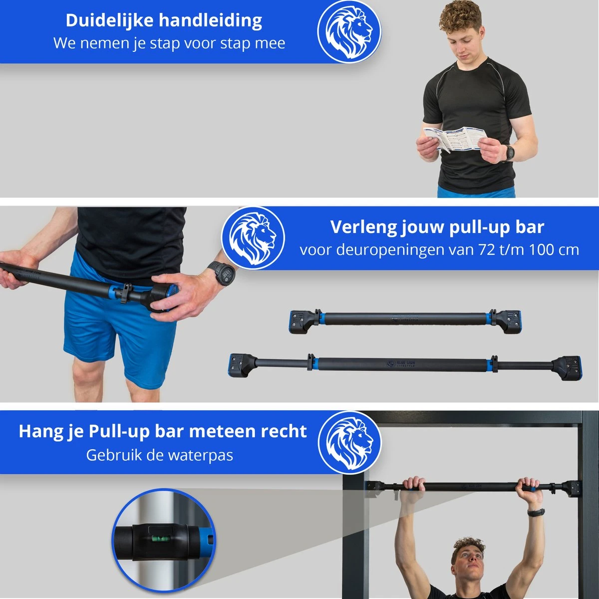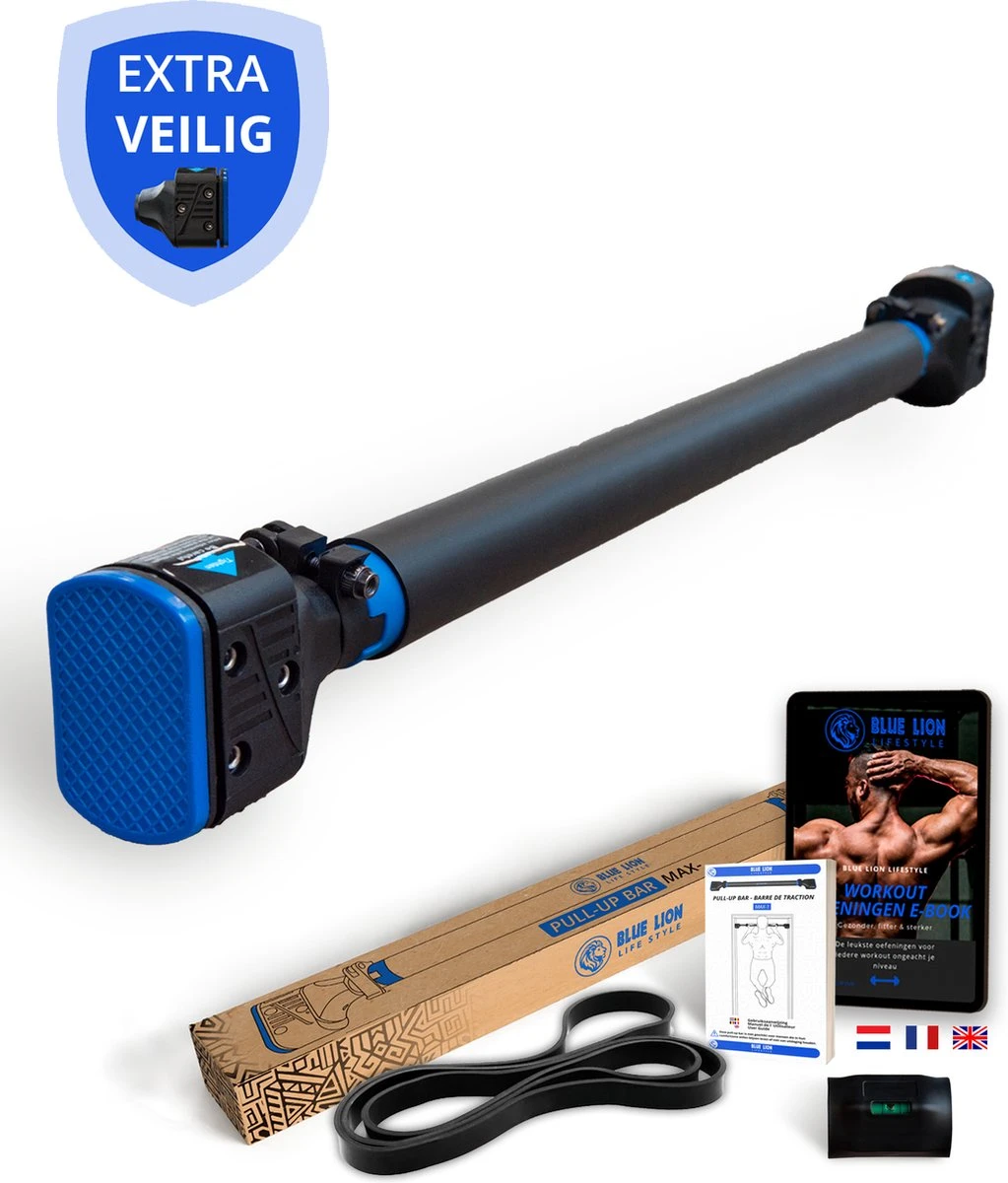 Als je dit leest, ben je op zoek naar een optrekstang en dat is een slimme keuze! Pull-ups zijn namelijke een van de meest effectieve en uitdagende oefeningen die je met je lichaam kunt doen. Wil jij ook graag veilig pull-ups trainen, zonder je huis uit te hoeven? Dan is deze Blue Lion MAX-2 Pull-up bar écht voor jou! Met jouw nieuwe pull-up bar kun je nieuwe gewoontes creëeren die je helpen om beter te worden. Naast Pull-ups, kun je in combinatie met de powerband uitdagende full-body workouts mee doen, ongeacht je niveau. Of je nu sterker, gespierder, of leniger wilt worden, wij helpen je graag om jouw doelen te behalen!