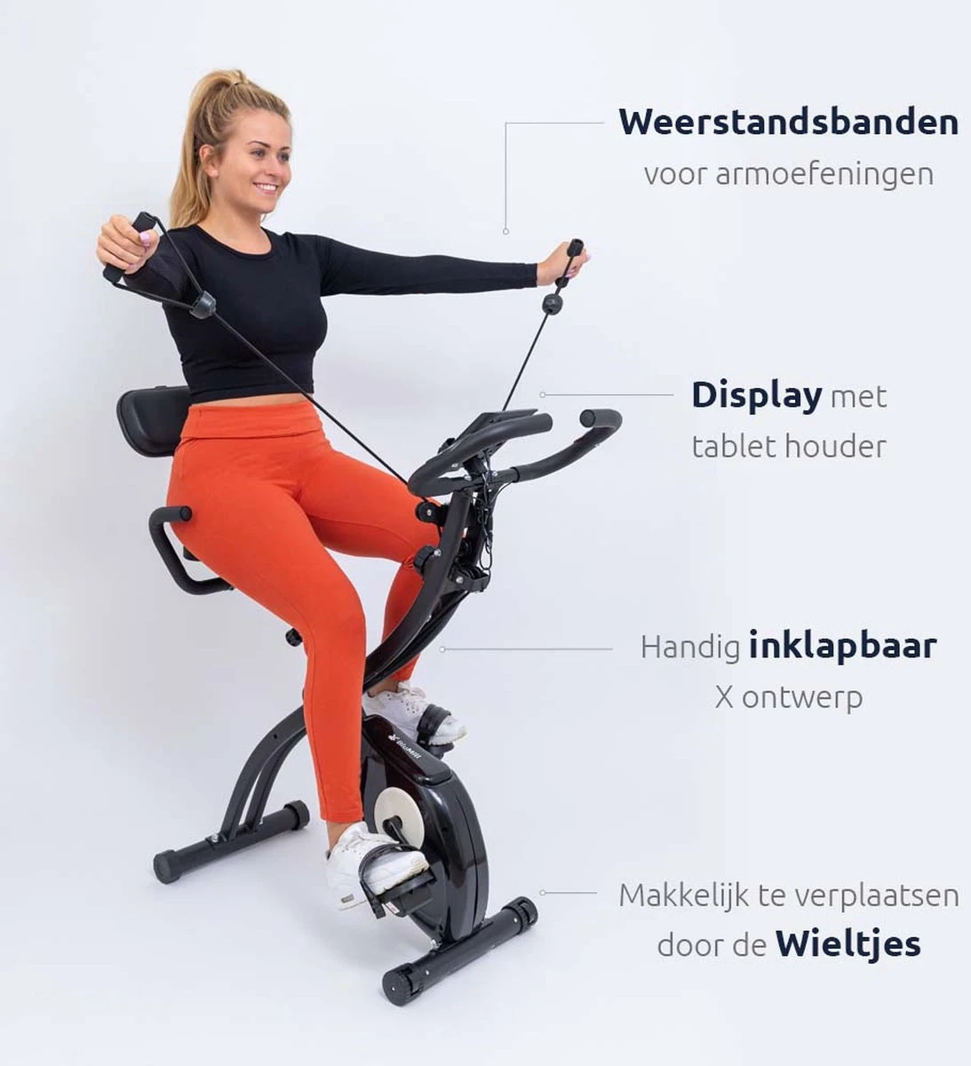 Om op verschillende niveaus te trainen kunt u kiezen uit 8 weerstanden. Deze weerstanden stelt u heel eenvoudig in dankzij de weerstandsknop onder het stuur. Ook is de hometrainer voorzien van extra weerstandsbanden voor armoefeningen. Zo traint u eenvoudig uw hele lichaam.