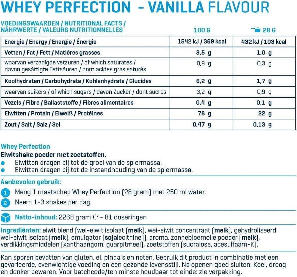 De whey eiwitshake met de hoogste klantwaardering in Europa: 9,3/10. Whey Perfection bevat per serving maar liefst 23 gram hoogwaardige Whey Proteïne, 3.6 gram glutamine en ruim 5 gram BCAA’s. Met Whey Perfection bereik je door de unieke samenstelling meer resultaat per shake als met welke andere Whey Proteïne dan ook! De enige echte nummer 1 in whey eiwit!