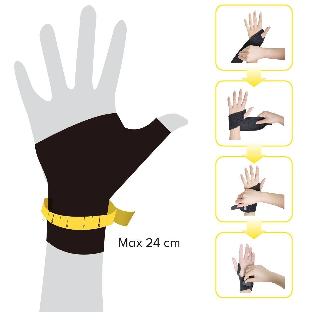 Eén bandage, draagbaar aan zowel de linker- als de rechterhand; de verstelbare bandjes passen om polsen met een omtrek tot 24 cm.
