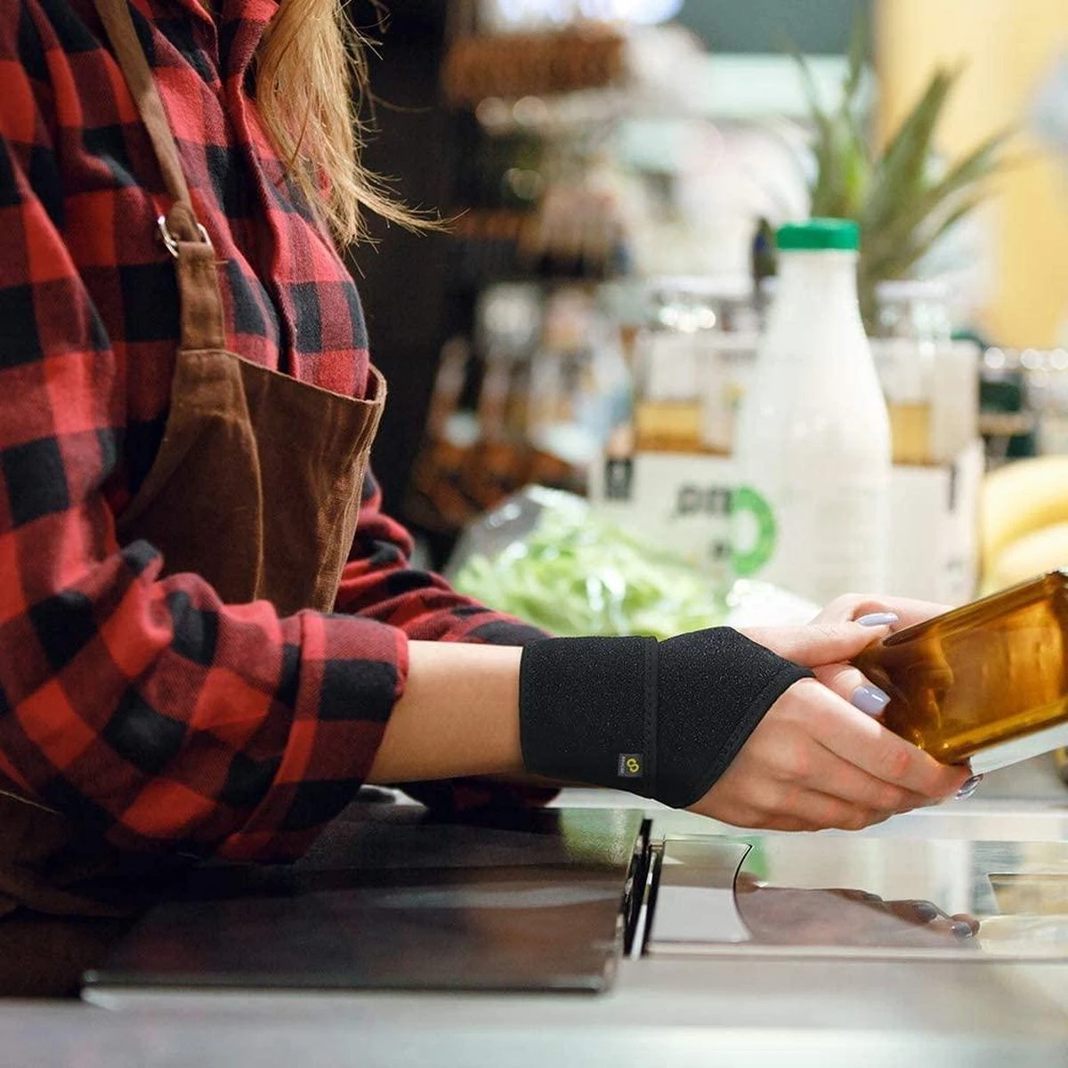 De neopreen/lycra super-cel composiet geeft elasticiteit in 4 richtingen voor een gelijk verdeelde compressie over de intercarpale gewrichten zonder beweging te belemmeren.