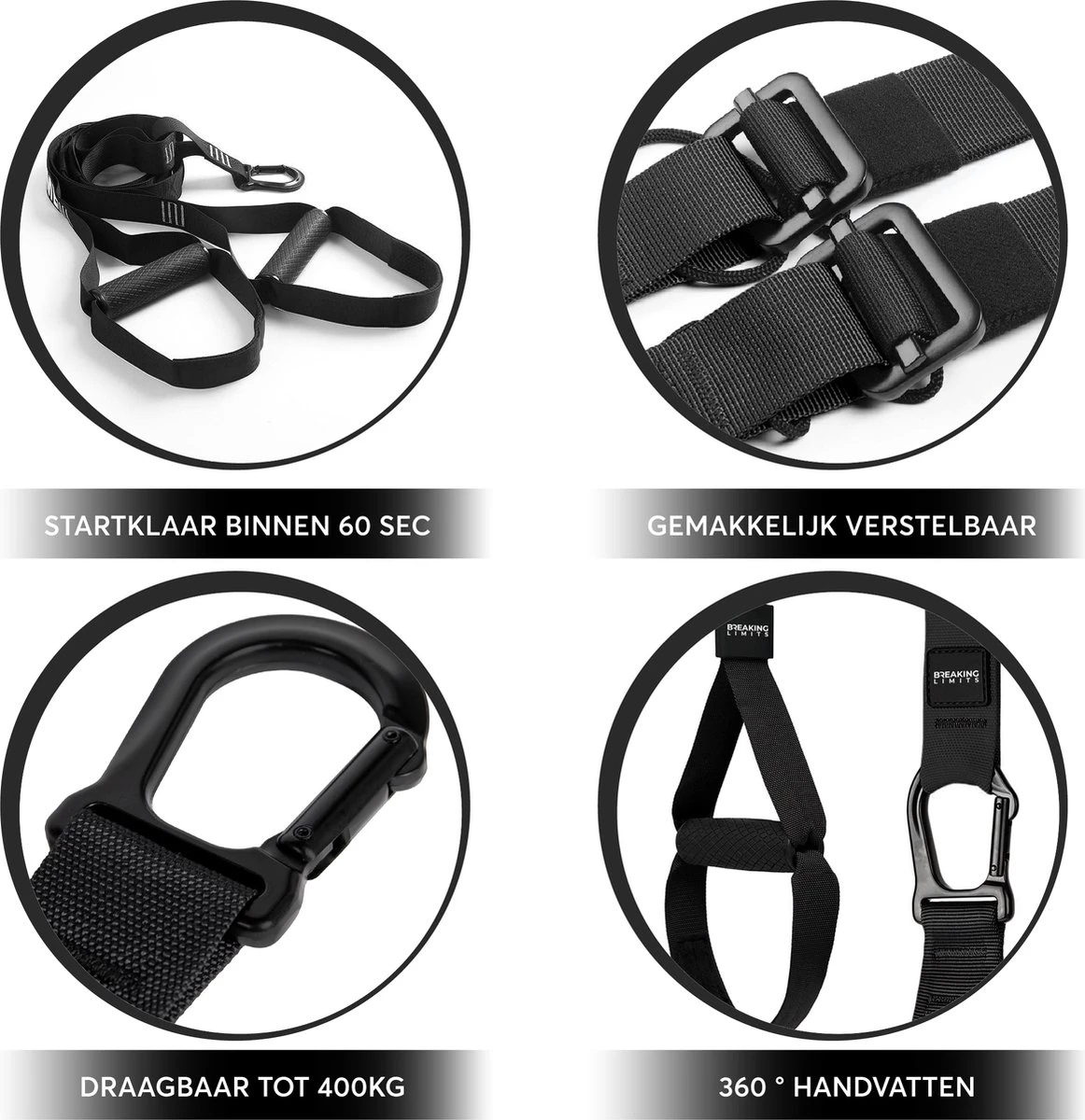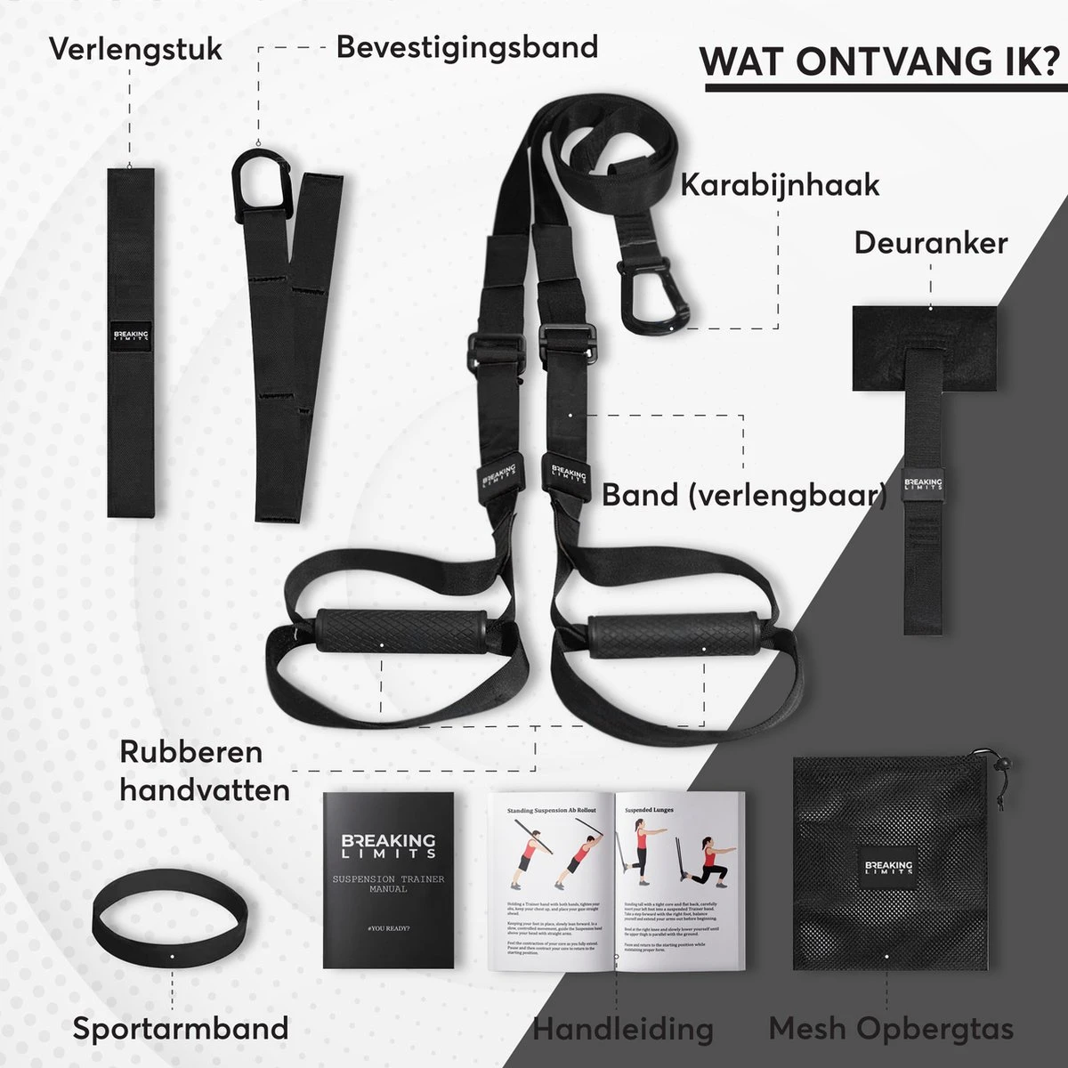 Wil jij waar en wanneer je maar kunt trainen? Train je liever thuis dan in de sportschool? Dan is de Breaking Limits Suspension Trainer Pro precies wat jij zoekt! De Suspension Trainer is gemakkelijk op te hangen aan een deur, boom of stang. Je traint daarnaast meerdere spiergroepen tegelijkertijd, waardoor je effectiever zult trainen en meer calorieën zult verbranden!