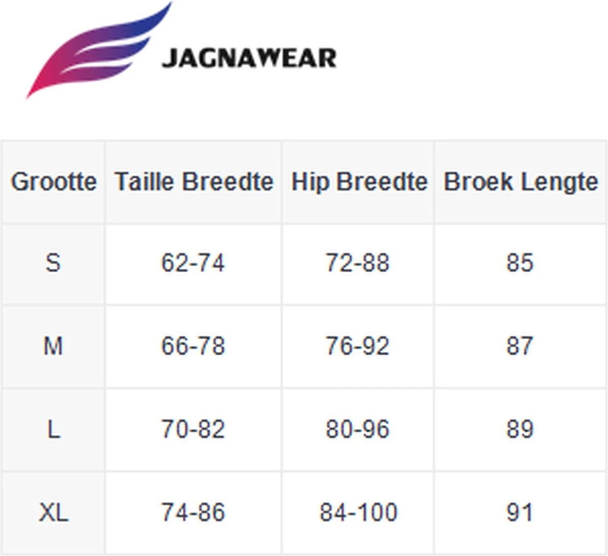 - Zie maattabel voor exacte afmetingen (afbeelding).