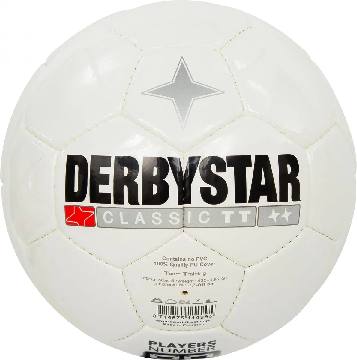 Classic TT 5 van Derbystar, geschikt voor heren en dames. De Derbystar Classic TT is een klassieke Derbystar bal en ons best verkochte model. Een uitstekende trainingsbal, vervaardigd uit duurzaam PU-materiaal. De uitstekende, stabiele vluchteigenschappen blijven ook bij lagere temperaturen behouden. Let op: de bal is beschikbaar in maat 5. Van balmaat 5 zijn er drie designs. Design (‘maat’) 0 is de witte bal zonder gouden vlakken. Design 1 heeft 8 x 1 gouden vlak en Design 3 heeft 4 x 3 gouden vlakken. Dankzij de verschillende designs zijn de ballen van verschillende elftallen uit elkaar te houden. Deze bal is enkel geschikt voor gras en wij raden af deze op straat te gebruiken, of op kunstgras wegens kans op verhoogde slijtage.