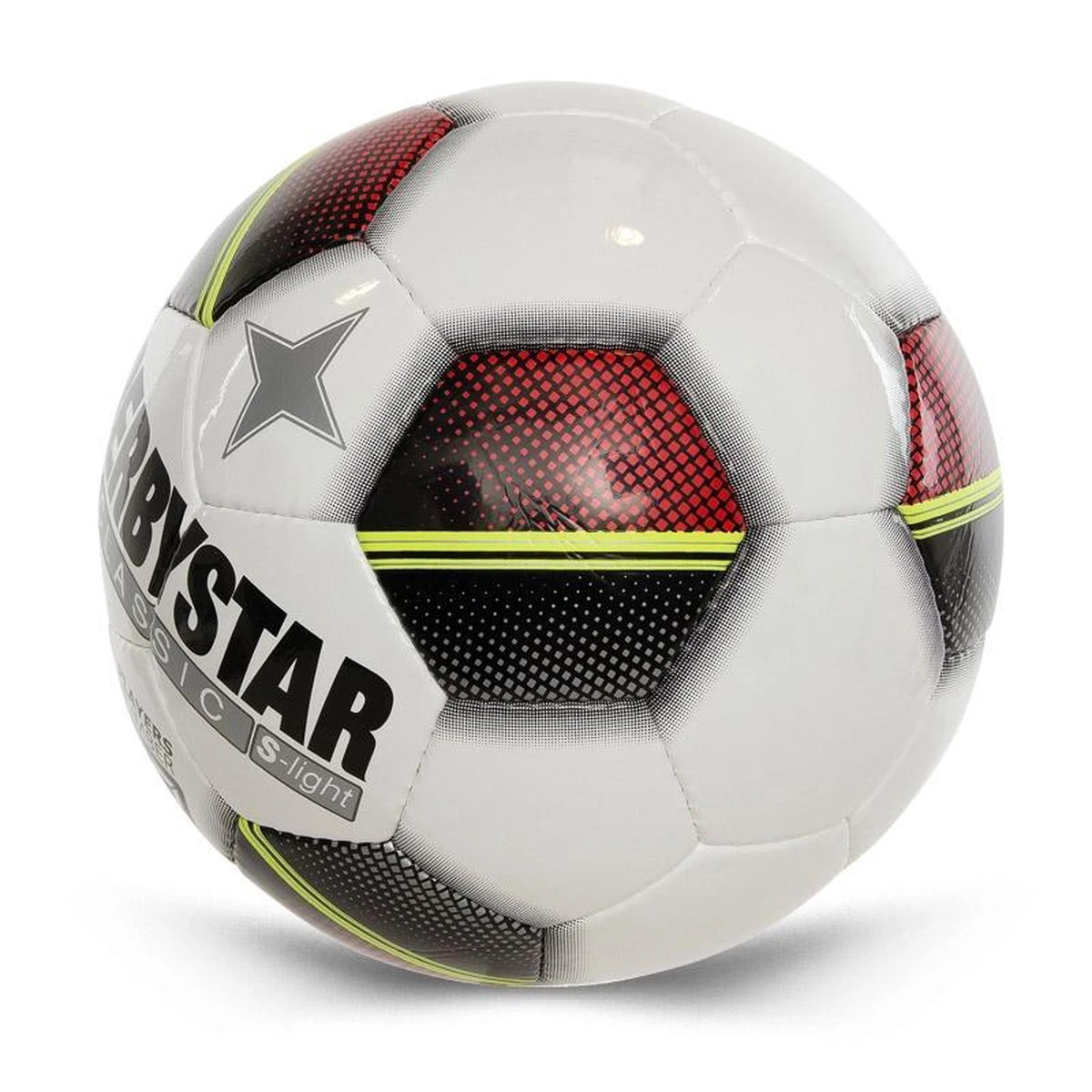 Classic TT Superlight van Derbystar, geschikt voor heren en dames. De Derbystar Classic TT is een klassieke Derbystar bal en ons best verkochte model. Deze super light-uitvoering (290 gram) is speciaal geschikt voor de jeugd O7 t/m O10. De handgestikte bal voldoet aan alle KNVB-richtlijnen voor jeugdvoetballen. Vervaardigd uit duurzaam PU-materiaal, dat aanvoelt als leer maar niet de nadelen heeft van leer. De uitstekende, stabiele vluchteigenschappen blijven ook bij lagere temperaturen behouden. Let op: de bal is beschikbaar in maat 3 (aanbevolen voor O7) en 4 en 5 (aanbevolen voor O8-O10). Van balmaat 5 zijn er drie designs. Design (‘maat’) 1 is de witte bal met 8 x 1 rode vlakken. Design 2 heeft 4 x 2 rode vlakken en Design 3 heeft 4 x 3 rode vlakken. Dankzij de verschillende designs zijn de ballen van verschillende elftallen uit elkaar te houden. Deze bal is enkel geschikt voor gras en wij raden af deze op straat te gebruiken, of op kunstgras wegens kans op verhoogde slijtage.