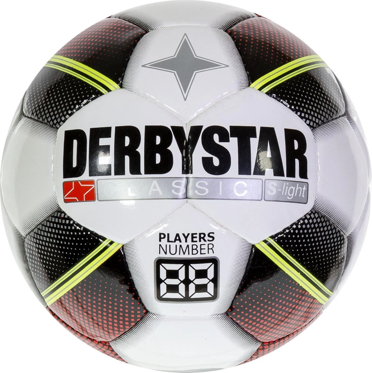 Classic TT Superlight van Derbystar, geschikt voor heren en dames. De Derbystar Classic TT is een klassieke Derbystar bal en ons best verkochte model. Deze super light-uitvoering (290 gram) is speciaal geschikt voor de jeugd O7 t/m O10. De handgestikte bal voldoet aan alle KNVB-richtlijnen voor jeugdvoetballen. Vervaardigd uit duurzaam PU-materiaal, dat aanvoelt als leer maar niet de nadelen heeft van leer. De uitstekende, stabiele vluchteigenschappen blijven ook bij lagere temperaturen behouden. Let op: de bal is beschikbaar in maat 3 (aanbevolen voor O7) en 4 en 5 (aanbevolen voor O8-O10). Van balmaat 5 zijn er drie designs. Design (‘maat’) 1 is de witte bal met 8 x 1 rode vlakken. Design 2 heeft 4 x 2 rode vlakken en Design 3 heeft 4 x 3 rode vlakken. Dankzij de verschillende designs zijn de ballen van verschillende elftallen uit elkaar te houden. Deze bal is enkel geschikt voor gras en wij raden af deze op straat te gebruiken, of op kunstgras wegens kans op verhoogde slijtage.