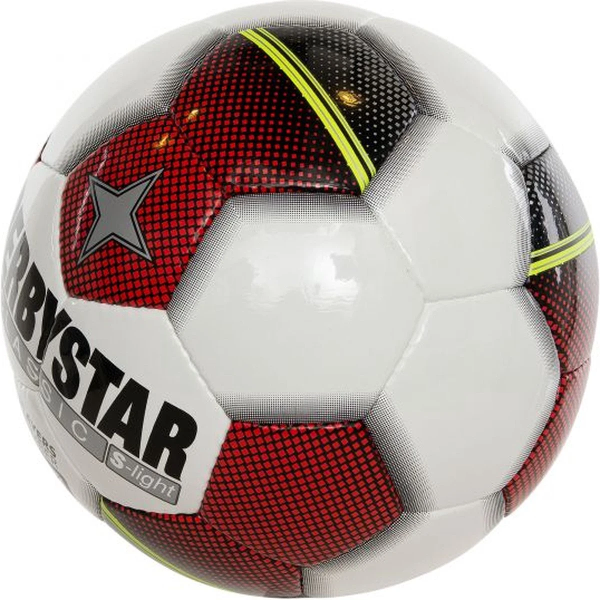Classic TT Superlight van Derbystar, geschikt voor heren en dames. De Derbystar Classic TT is een klassieke Derbystar bal en ons best verkochte model. Deze super light-uitvoering (290 gram) is speciaal geschikt voor de jeugd O7 t/m O10. De handgestikte bal voldoet aan alle KNVB-richtlijnen voor jeugdvoetballen. Vervaardigd uit duurzaam PU-materiaal, dat aanvoelt als leer maar niet de nadelen heeft van leer. De uitstekende, stabiele vluchteigenschappen blijven ook bij lagere temperaturen behouden. Let op: de bal is beschikbaar in maat 3 (aanbevolen voor O7) en 4 en 5 (aanbevolen voor O8-O10). Van balmaat 5 zijn er drie designs. Design (‘maat’) 1 is de witte bal met 8 x 1 rode vlakken. Design 2 heeft 4 x 2 rode vlakken en Design 3 heeft 4 x 3 rode vlakken. Dankzij de verschillende designs zijn de ballen van verschillende elftallen uit elkaar te houden. Deze bal is enkel geschikt voor gras en wij raden af deze op straat te gebruiken, of op kunstgras wegens kans op verhoogde slijtage.