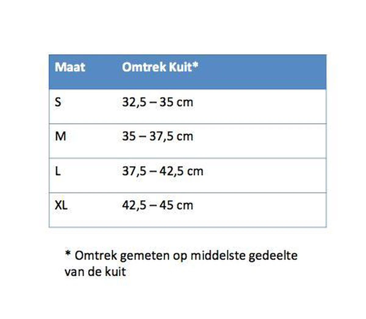 De bandage is in meerdere maten verkrijgbaar. Door de omtrek van het middelste gedeelte van de kuit op te meten, kan de voor u juiste maat worden bepaald. Zie afbeelding voor maattabel!