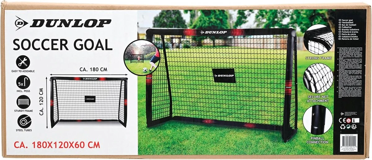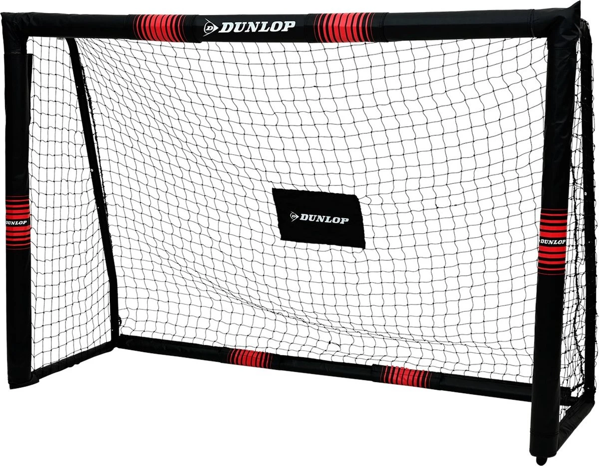 Met het hoogwaardige voetbaldoel van Dunlop met schuimrubberen bekleding in zwart/neonrood Snelle en eenvoudige opbouw: beschreven stangen en een eenvoudige klikmontage maken de opbouw van het voetbaldoel kinderspel Extra veilig: palen en latten zijn volledig met EPE-schuim ommanteld. Tegelijkertijd ontstaat er een voetbaldoel met grote palen en laatdiameter Staand en weerbestendig: 7 U-haringen zorgen voor een optimale standfixatie en de complete ommanteling van stevig tarpaulin-materiaal maakt dit voetbaldoel bovendien absoluut weerbestendig