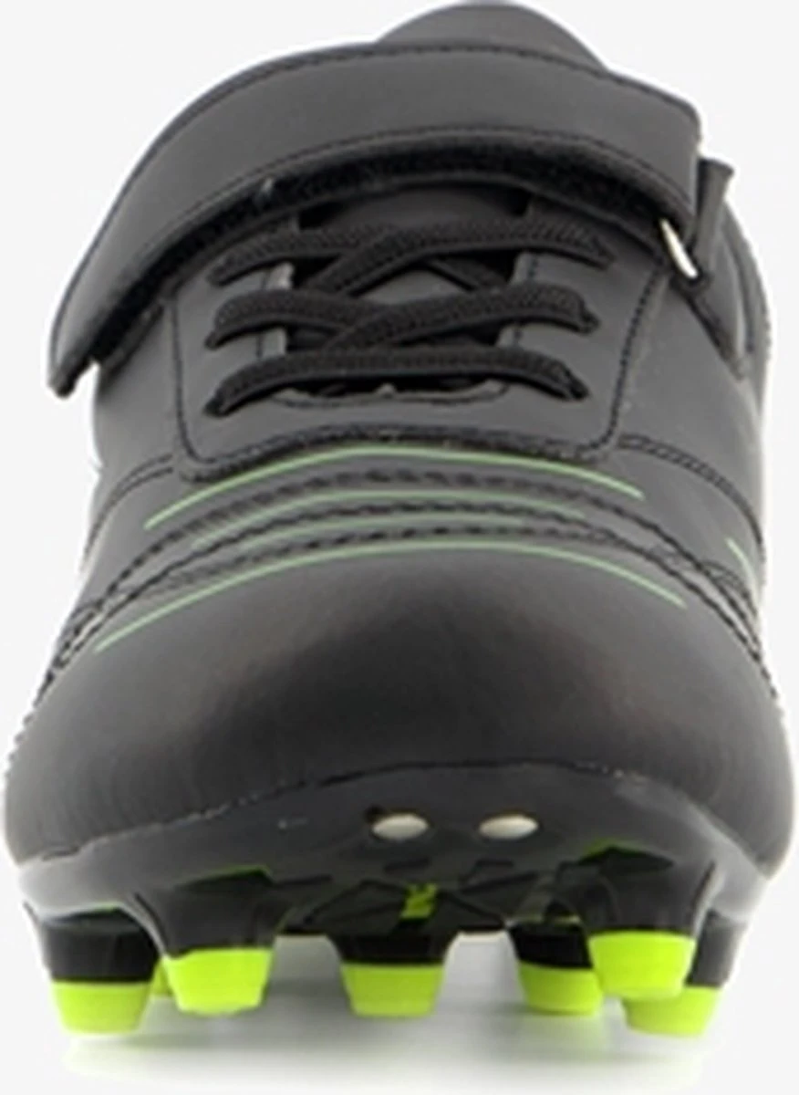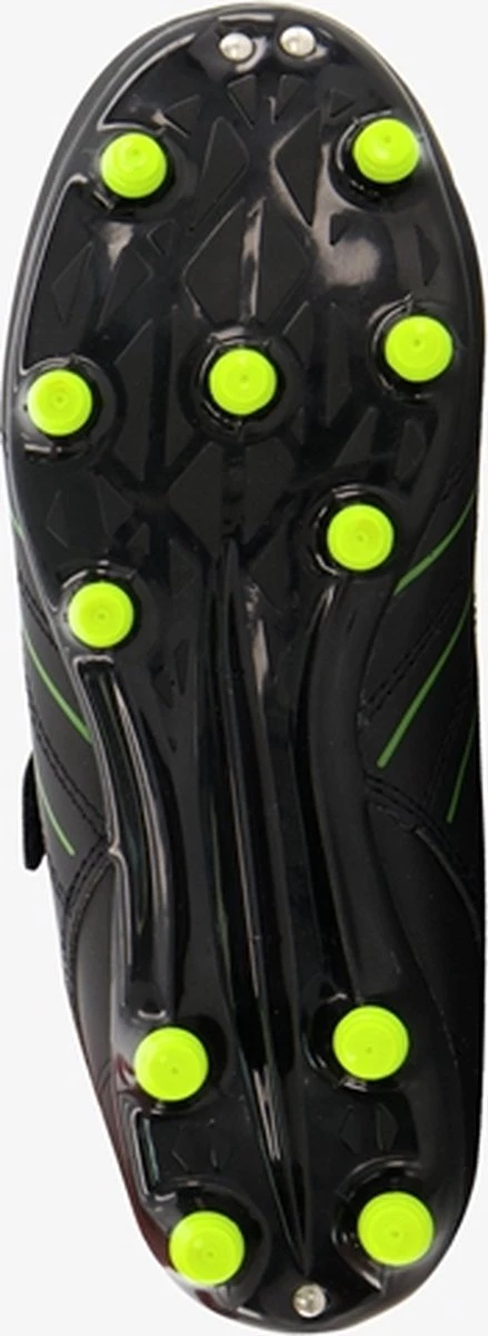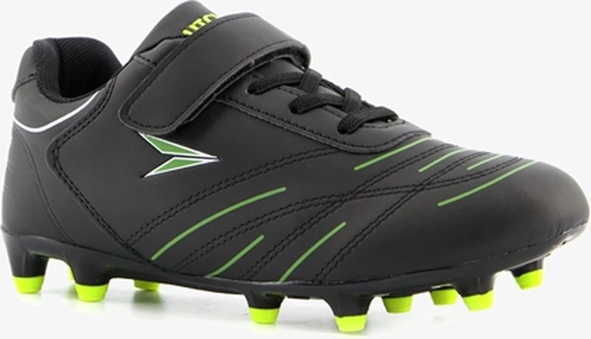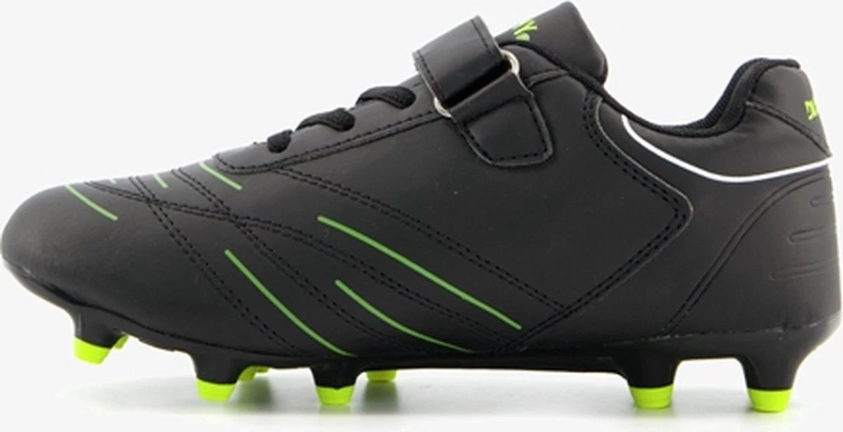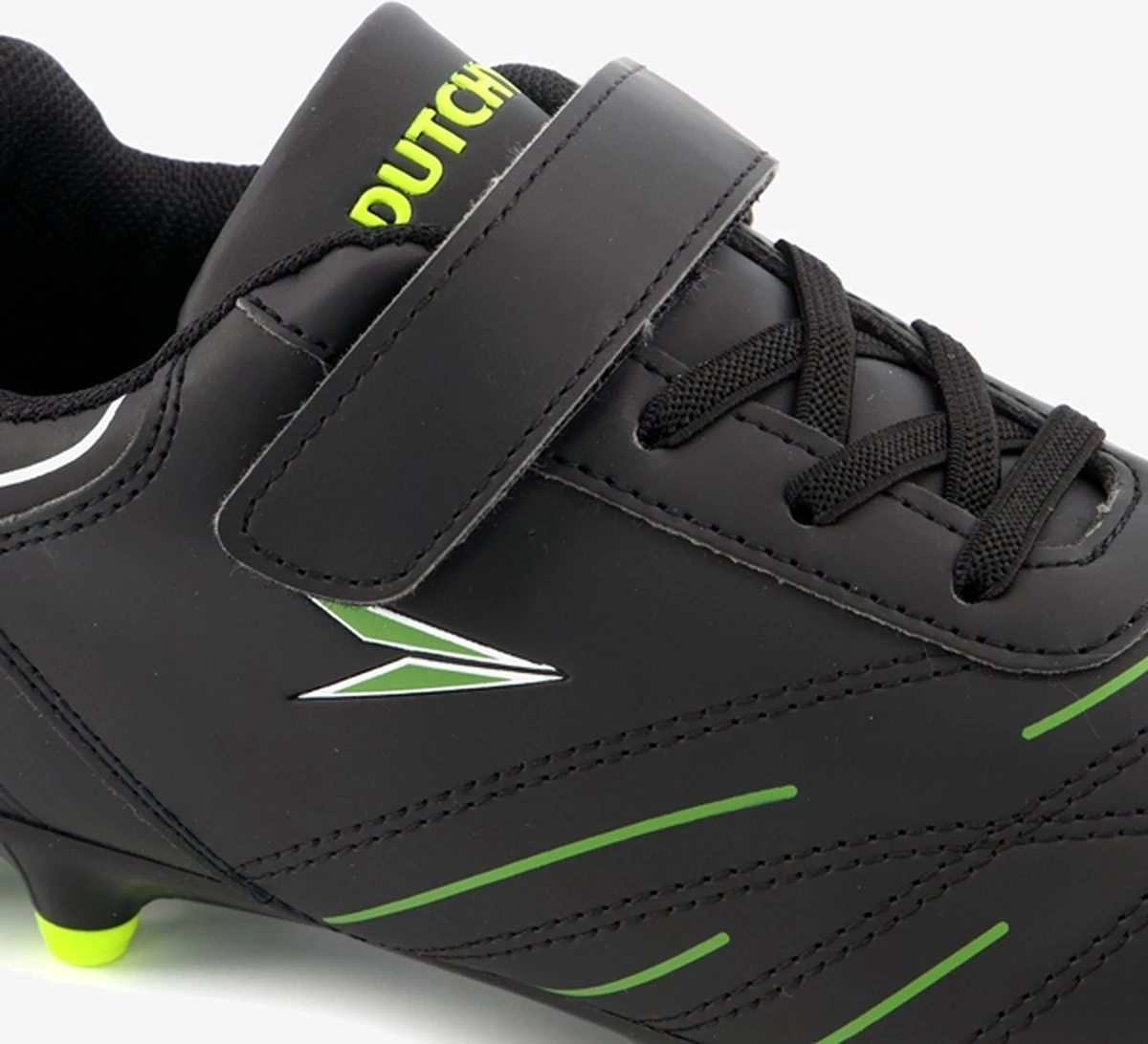 Zwarte Dutchy Attack voetbalschoenen voor kinderen met groene details. Gemaakt van imitatieleer, een binnenwerk van textiel en een stevige Firm Ground zool. Deze FG zool is geschikt voor (droog)natuurgras en bestaat uit kunststof noppen die je veel grip geven op het veld. De voetbalschoenen hebben elastische veters met klittenbandsluiting voor een makkelijke instap en optimale pasvorm. De uitneembare maatcheck-binnenzool is gemaakt van textiel. De voetbalschoenen hebben groene accenten op het bovenwerk.