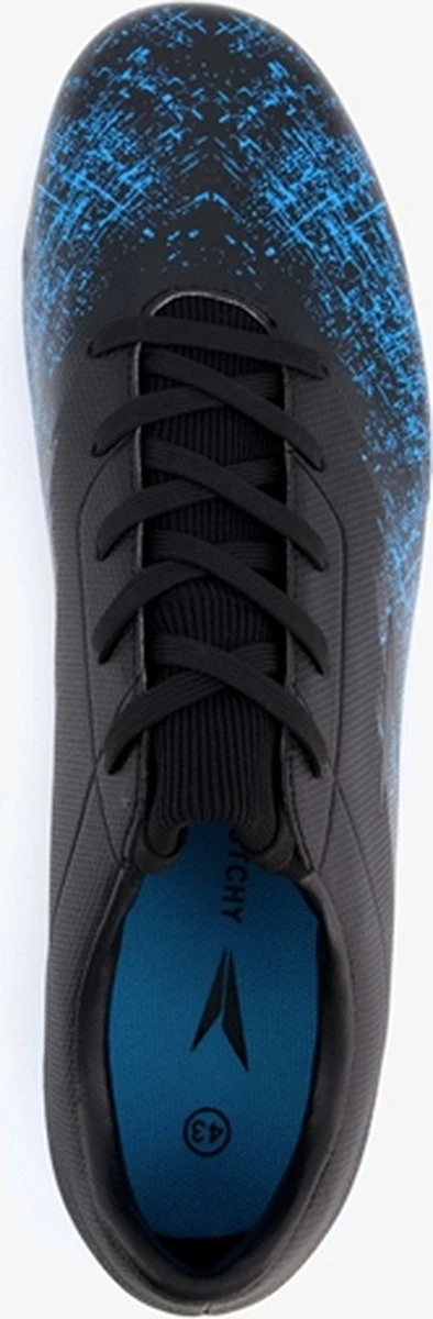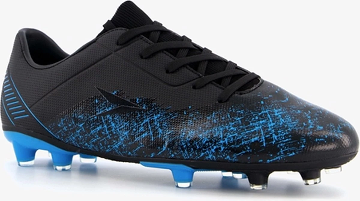 Zwarte Dutchy Counter voetbalschoenen. Gemaakt van imitatieleer, een binnenwerk van iimtatieleer en een stevige Firm Ground zool. Deze FG zool is geschikt voor (droog)natuurgras en bestaat uit kunststof noppen die je veel grip geven op het veld. De voetbalschoenen hebben een vetersluiting. De voetbalschoenen hebben blauwe accenten op het bovenwerk en een gedeeltelijk blauwe buitenzool.