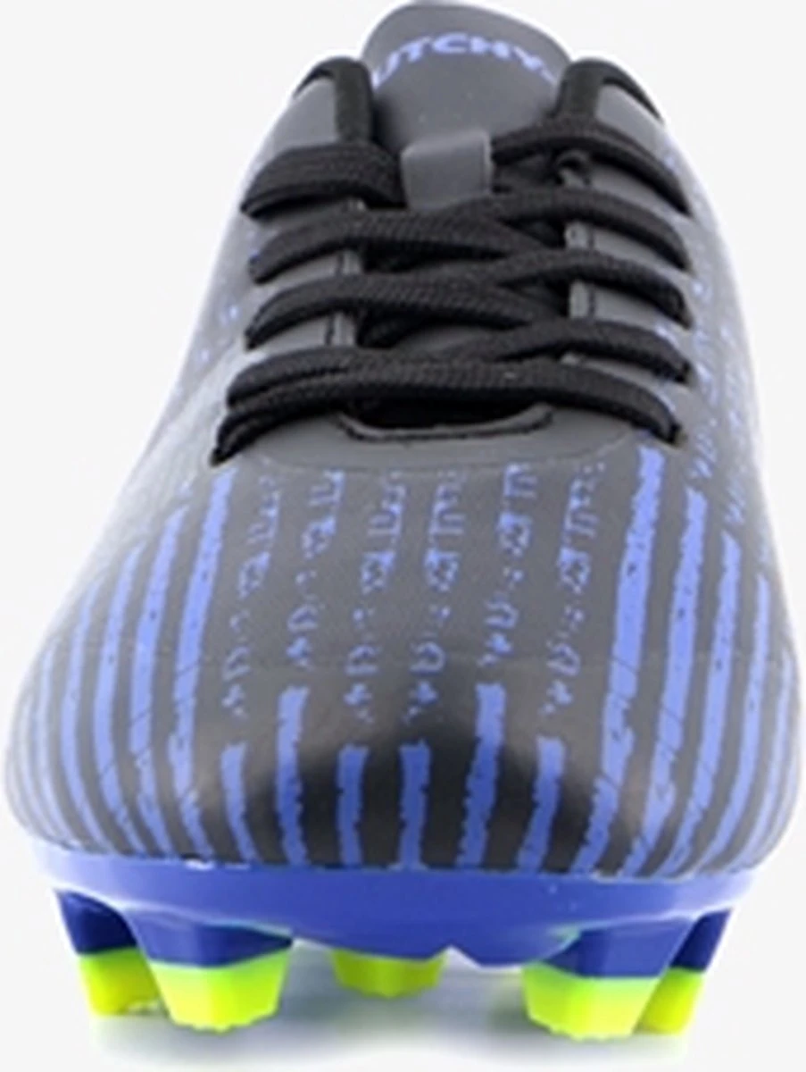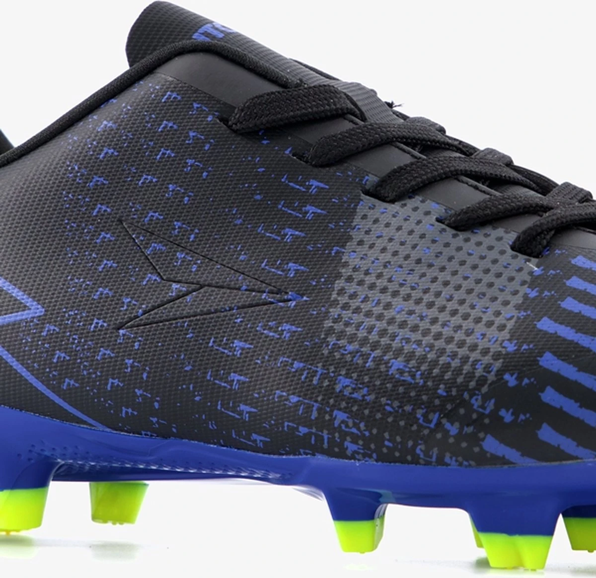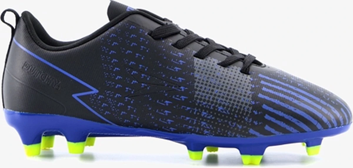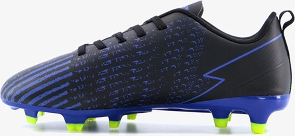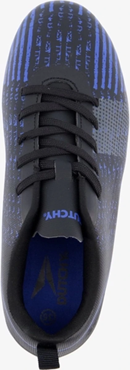 Blauw/zwarte Dutchy Sprint voetbalschoenen FG voor kids. Gemaakt van imitatieleer, een binnenwerk van textiel en een stevige FG profielzool met vaste noppen. De voetbalschoenen hebben een vetersluiting en uitneembare binnenzool van textiel. De FG zool is geschikt voor (droog)natuurgras en bestaat uit kunststof noppen die je veel grip geven op het veld. De buitenzool zorgt voor stabiliteit en wendbaarheid op harde ondergronden en is gemaakt van duurzaam, soepel en slijtvast materiaal. Voorzien van blauwe accenten op het bovenwerk en de zool.