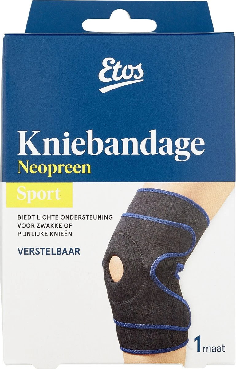 De verstelbare Etos Kniebandage Neopreen voor de lichte ondersteuning van zwakke, overbelaste of geblesseerde knieën of ter ontlasting van peesontstekingen. Gebruik de bandage op de onbeschadigde huid. .De bandage