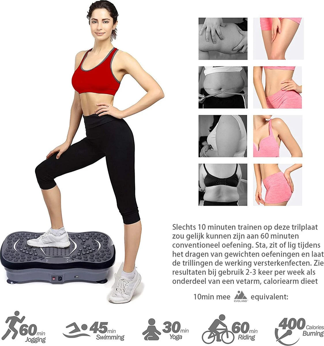 De EVOLAND is een innovatieve trilplaat voor thuis en werkt middels de bewezen wetenschappelijke vibratietechnologie. Dankzij de 700-800 aanspanningen per minuut Trillingsamplitude 10-12 mm worden effectieve bewegingen gegenereerd. Doordat de spieren in je lichaam zich dankzij de trillingen automatisch aanspannen wordt een optimaal trainingsresultaat gerealiseerd en de vetverbranding en bloedcirculatie verbeterd. De EVOLAND fitness trilplaat is voorzien van een Bluetooth-functie met handgrepen en elastische weerstandsbanden.