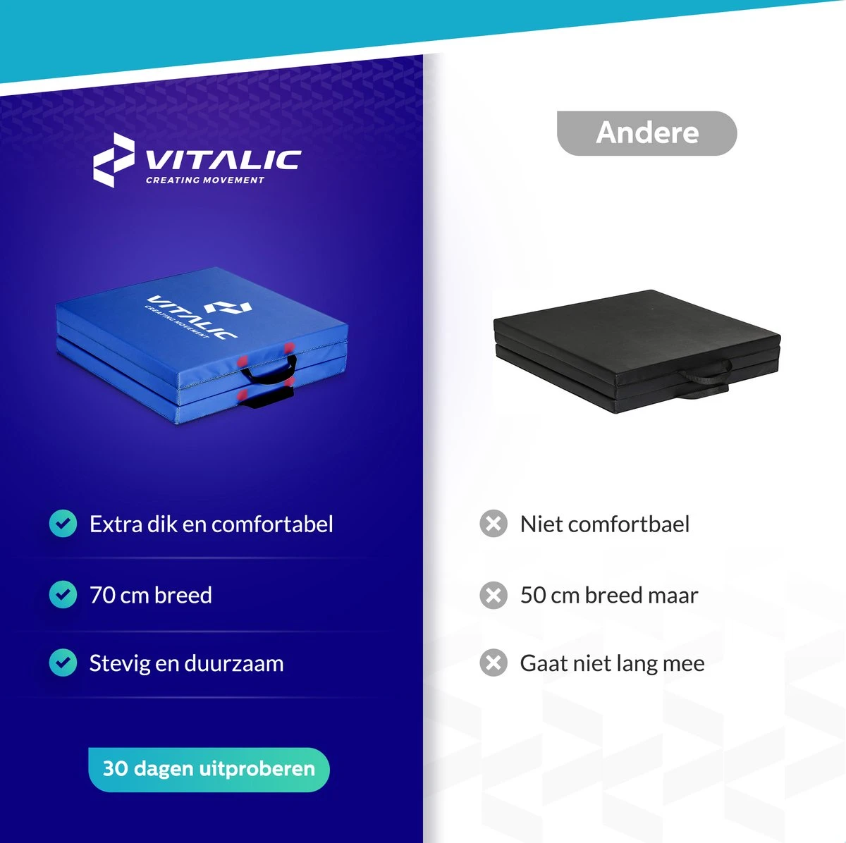 OPVOUWBAAR – Doordat de Vitalic mat uit drie opwaoubare delen bestaat pak je deze in een handomdraai in en neem je hem overal mee naar toe. Daarnaast krijg je bij deze mat een nette opbergtas waardoor je de mat niet onder je arm hoeft mee te slepen.