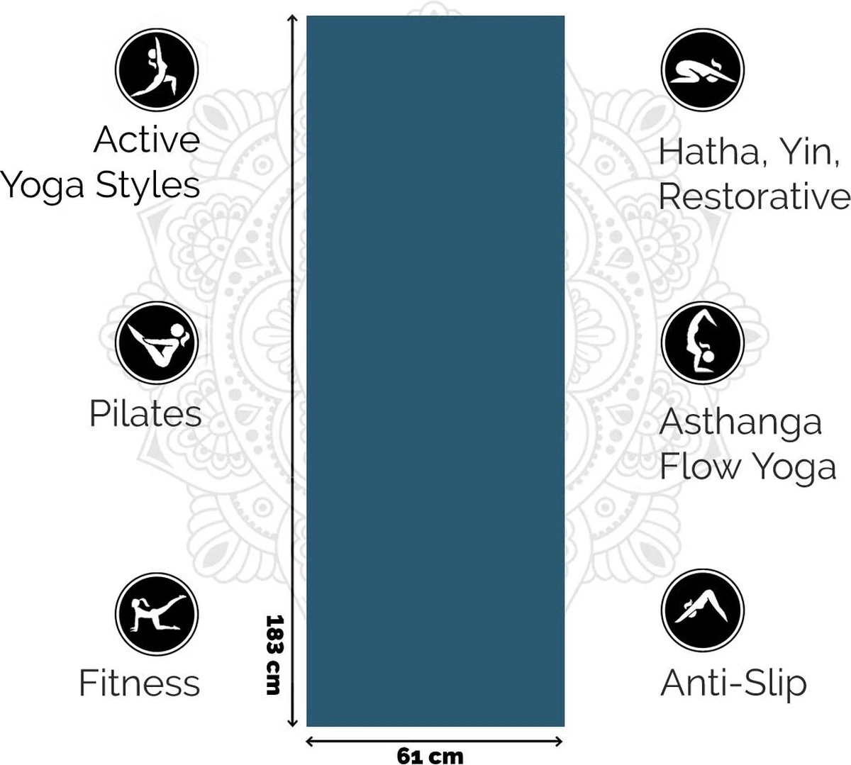 183 cm lang x 61 cm breed x 6 mm dik Lichtgewicht (+/- 1.5 kg) Anti slip / sticky Wordt steeds stroever door gebruik Gemaakt van OEKO-TEX gecertificeerd PVC zonder gifstoffen of zware metalen Geschikt voor een dagelijkse yogapractice Geschikt voor alle yogastijlen en ook als fitnessmat & pilates mat Ook een fijn yogamatje voor beginners