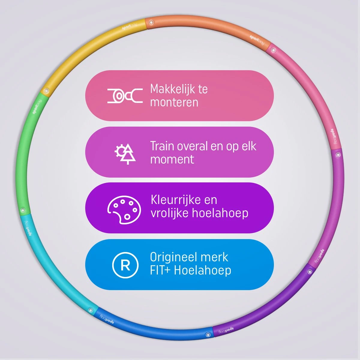- Fit+ Happy fitnesshulahoepen hebben een zeer dikke en zachte buis van 4 cm.