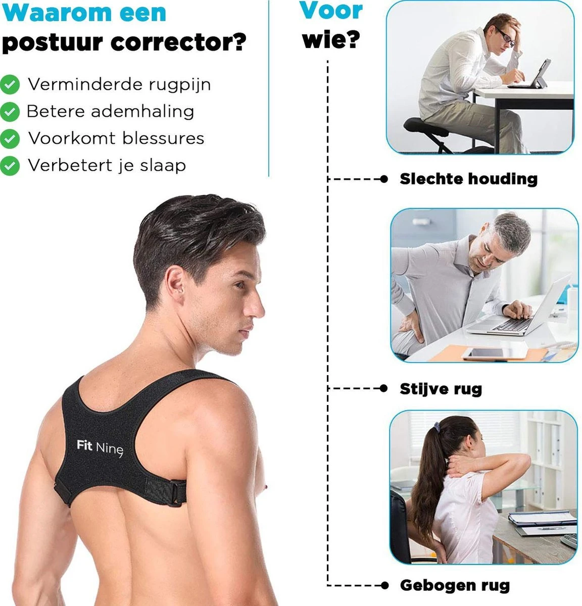 Heb jij na een lange dag ‘s avonds pijn in je rug, nek of schouder spieren? Heb je het idee dat je continu een verkeerde houding aanneemt tijdens het lopen of liggen? De nieuwe posture corrector van Fit Nine biedt een oplossing voor deze problemen.