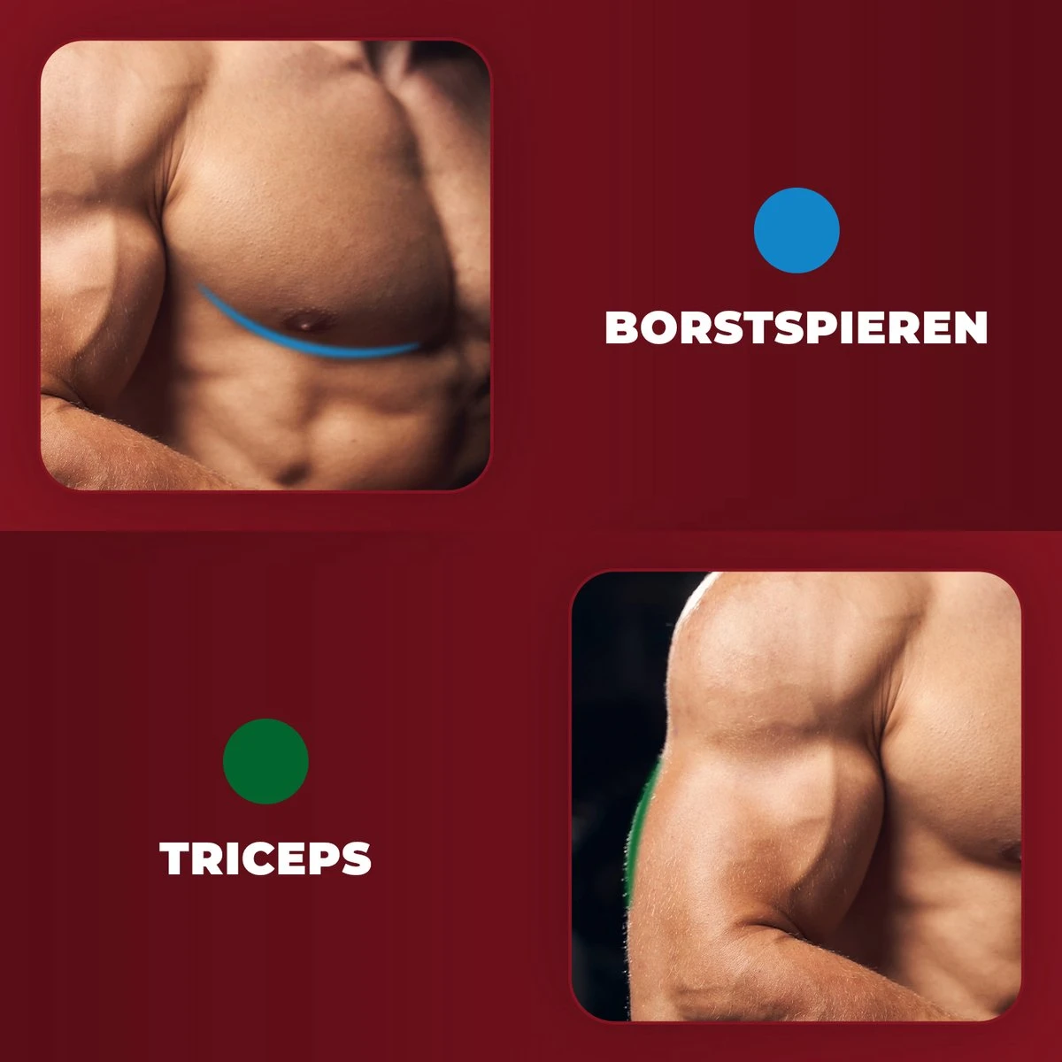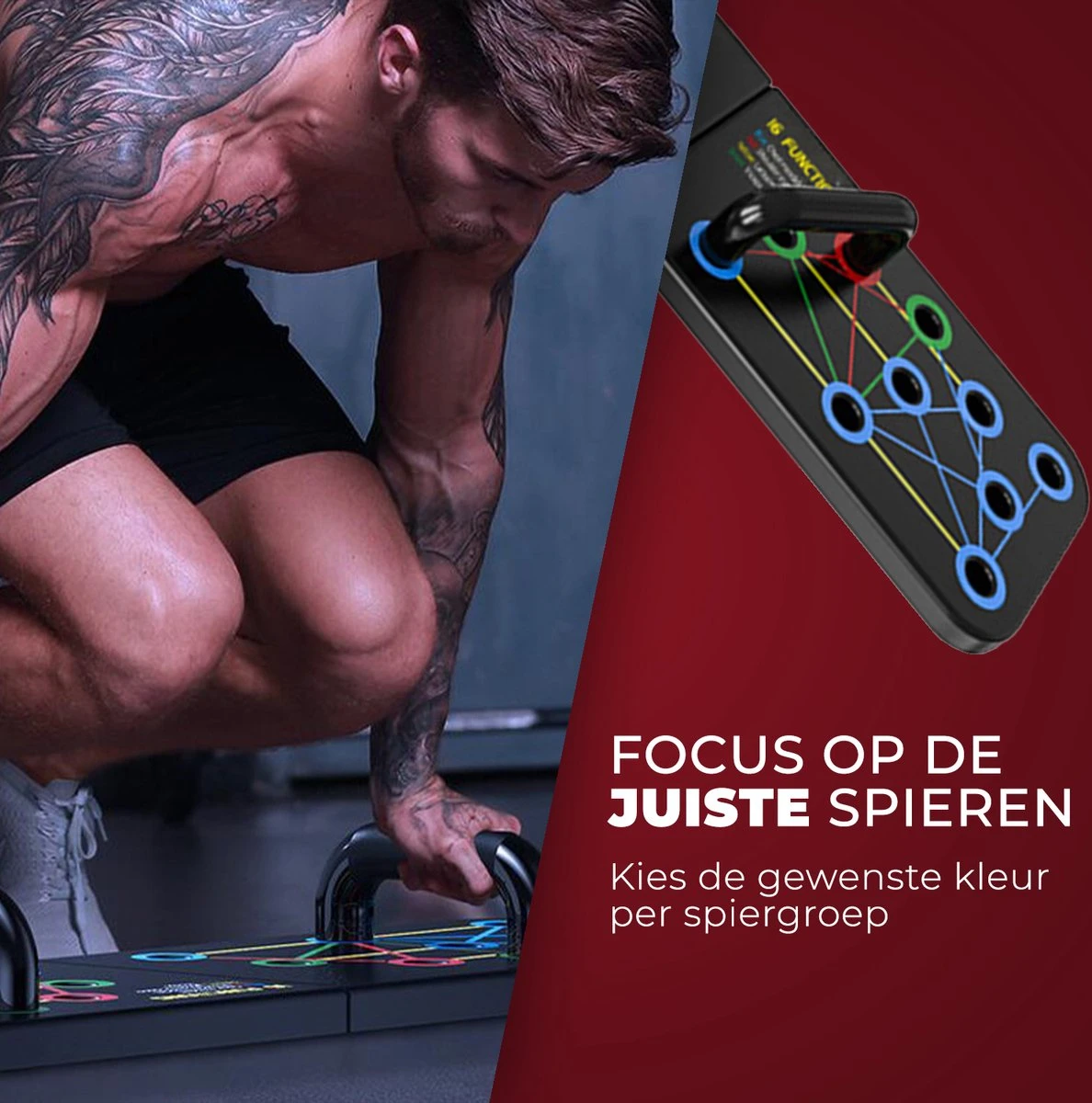 met ons push up bord kan je alle spiergroepen van het bovenlichaam trainen door de handvaten op een andere positie te plaatsen. de kleuren op het bord vertegenwoordigen de verschillende spiergroepen. (blauw borst, groen triceps, rood schouders, geel rug)