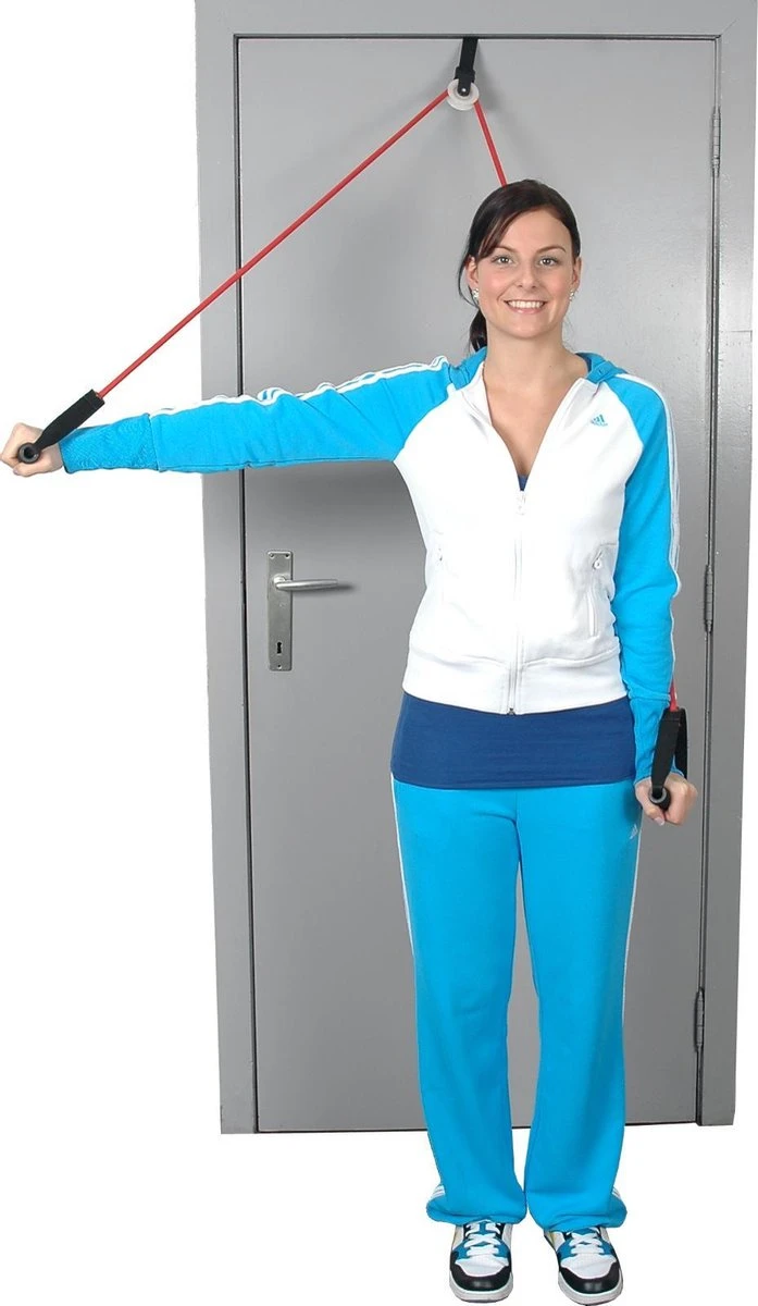 De schoudertrainer is overal toepasbaar door het ophangsysteem dat op iedere deur past. De fitness tube is voorzien van een deuranker. Het deuranker klemt zich tussen de deur en de deurpost als de deur gesloten. De anker kan op elke gewenste hoogte geplaatst worden. Alle oefeningen worden staand of zittend voor de deur uitgevoerd.