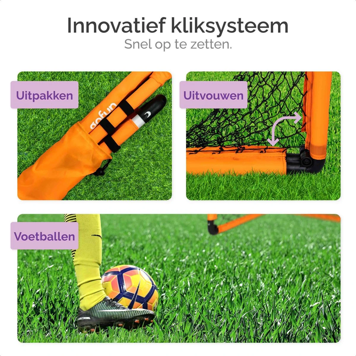 Altijd en overal een lekker potje voetballen deze zomer? Vanaf nu kan het, met de voetbalgoaltjes van Gofun! Zeg maar gedag tegen het in elkaar schuiven van frames, netten spannen, of zakken vol met onderdelen. De Gofun goaltjes zitten vernuftig in elkaar. Dat betekent dat je ze binnen drie seconden op kan zetten, dankzij het praktische kliksysteem. Je haalt het voetbaldoel uit de draagtas, vouwt hem uit, en je bent direct klaar om te spelen. Het frame klikt automatisch