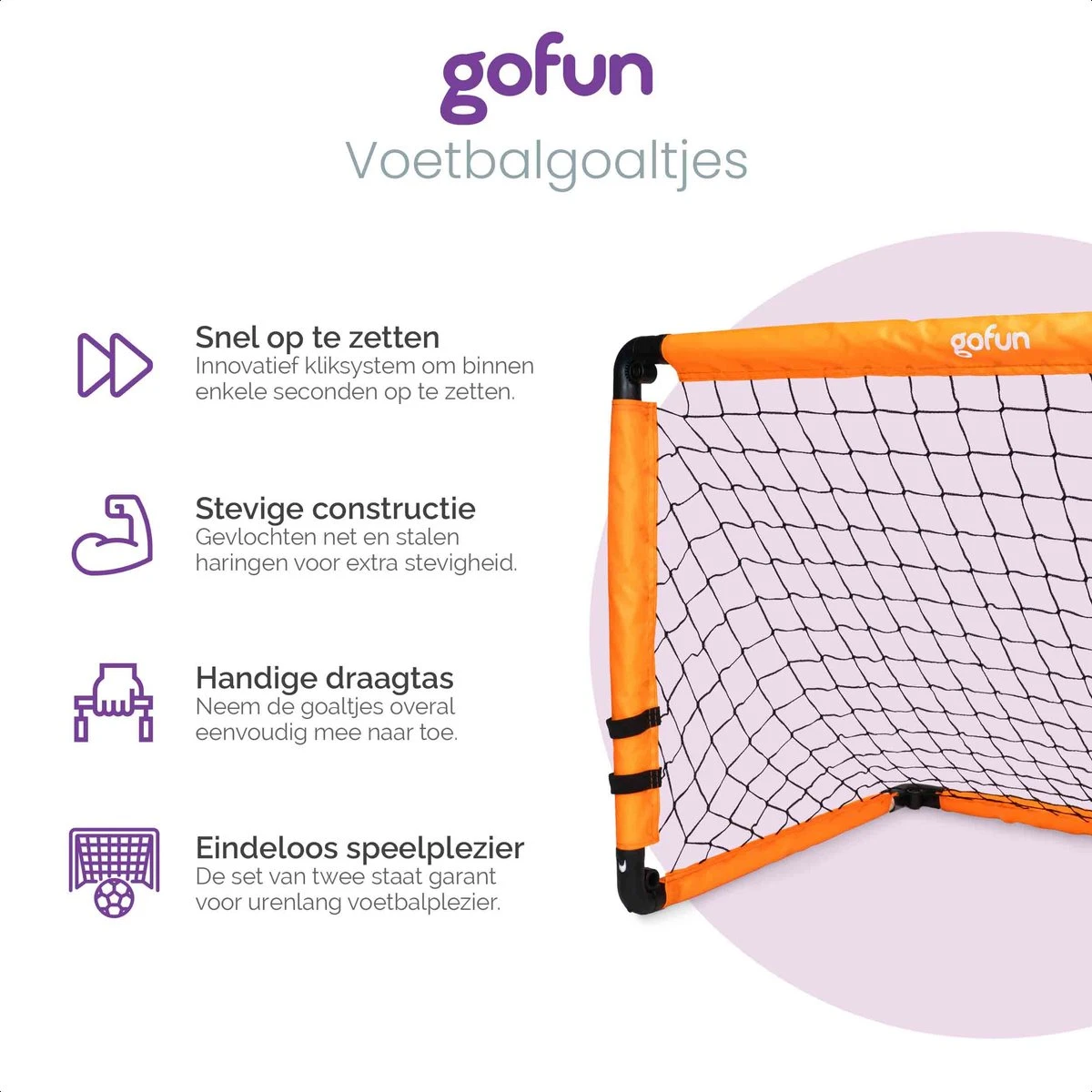 verankeren. Daarnaast beschikken de goaltjes over een gevlochten net. Dat zorgt er voor dat de netten vele malen langer mee gaan dan andere voetbalgoaltjes van dit formaat. Zo heb jij jarenlang plezier van jouw Gofun voetbalgoaltjes.