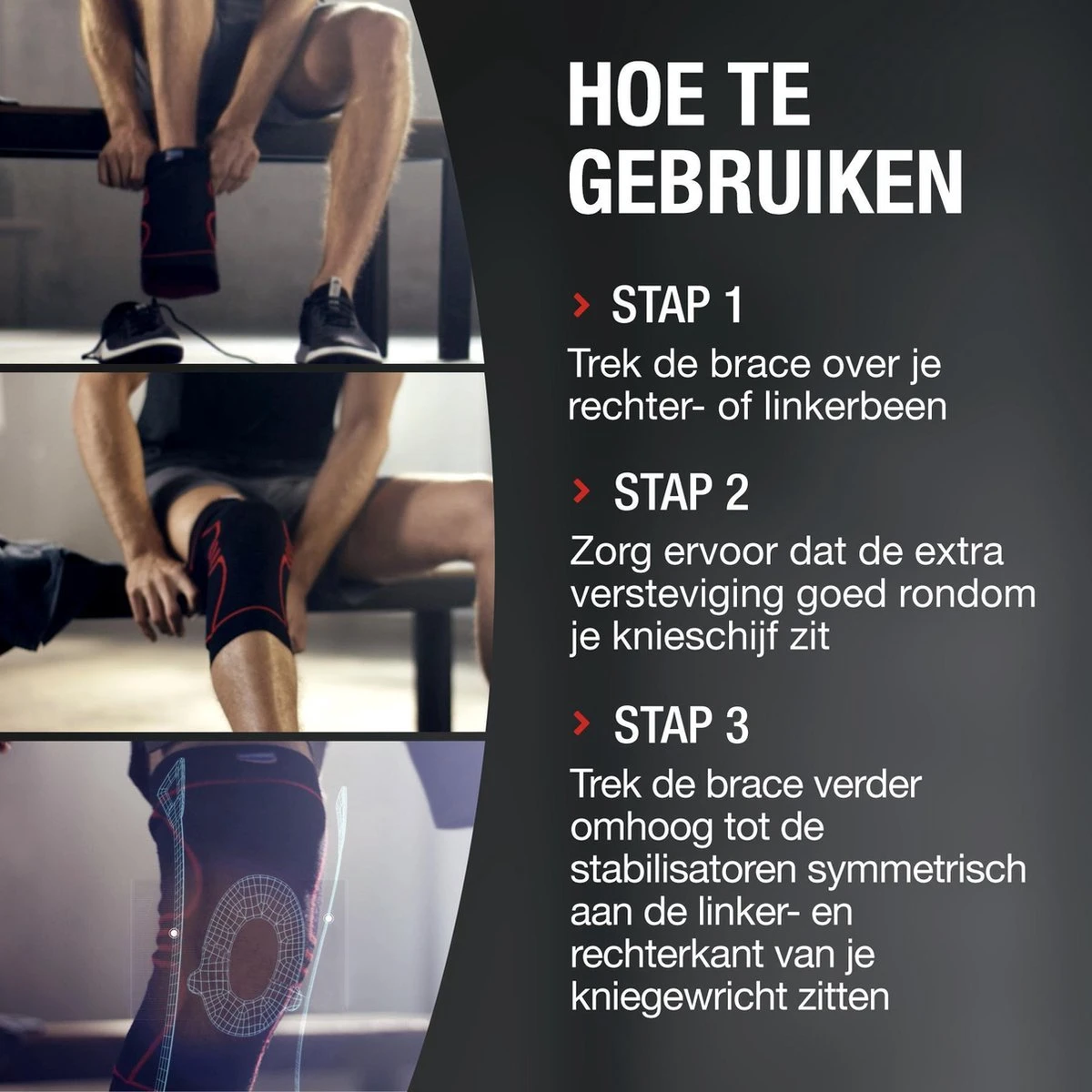 - Gebruik: trek de brace over je rechter- of linkerbeen, je tenen eerst (let op: het label moet altijd aan de voorkant zitten)/ trek de brace over je rechter- of linkerknie, plaats de extra versteviging rond je knieschijf/ trek de brace omhoog tot de extra stabilisatoren symmetrisch aan de linker- en rechterkant van je kniegewricht zitten