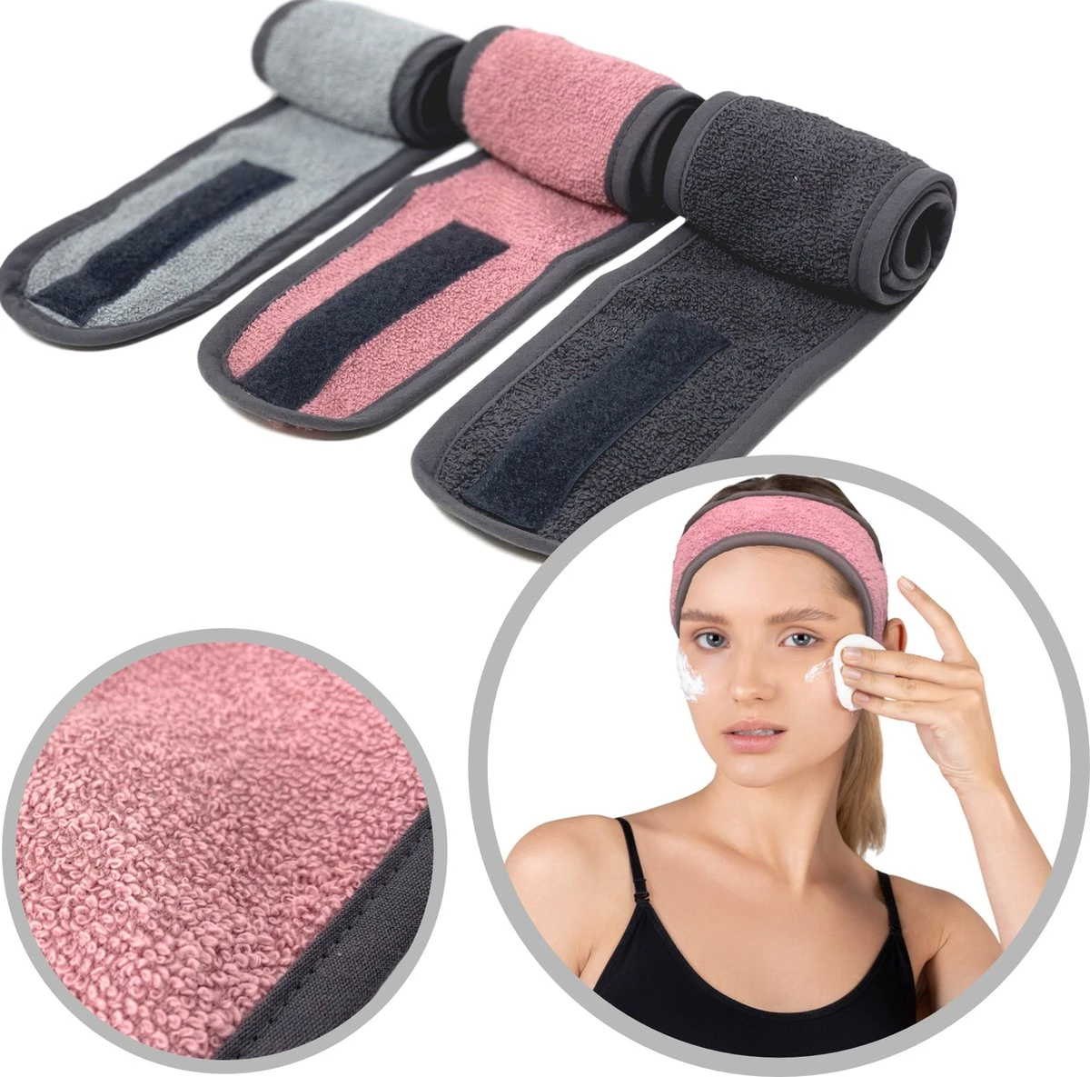 - DETAILS: Je ontvangt een set van 3 haarbanden in de kleuren grijs, oudroze en lichtgrijs. De haarbanden zijn gemaakt van badstof van 100% katoen en meten ca. 9 x 62 cm. De banden zijn verstelbaar met een handige klittenbandsluiting.