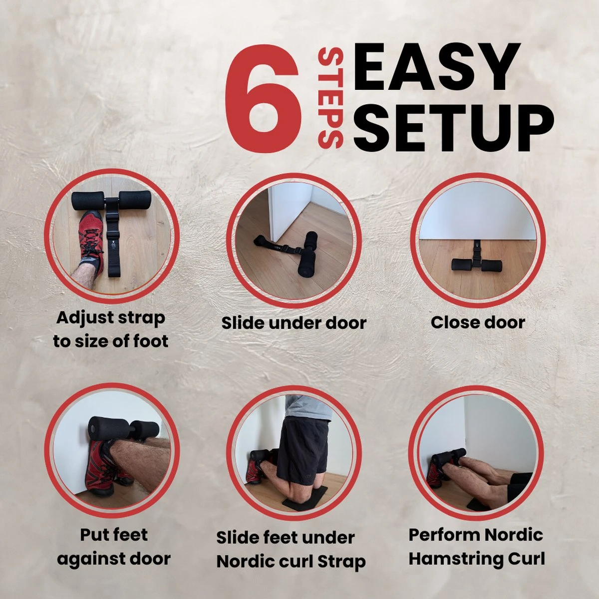 The ultimate solution for hamstring injury prevention! Our strap is designed for athletes, fitness enthusiasts, and anyone looking to improve their hamstring strength. The Nordic Bench solution. Comes with a free cushioned mat!