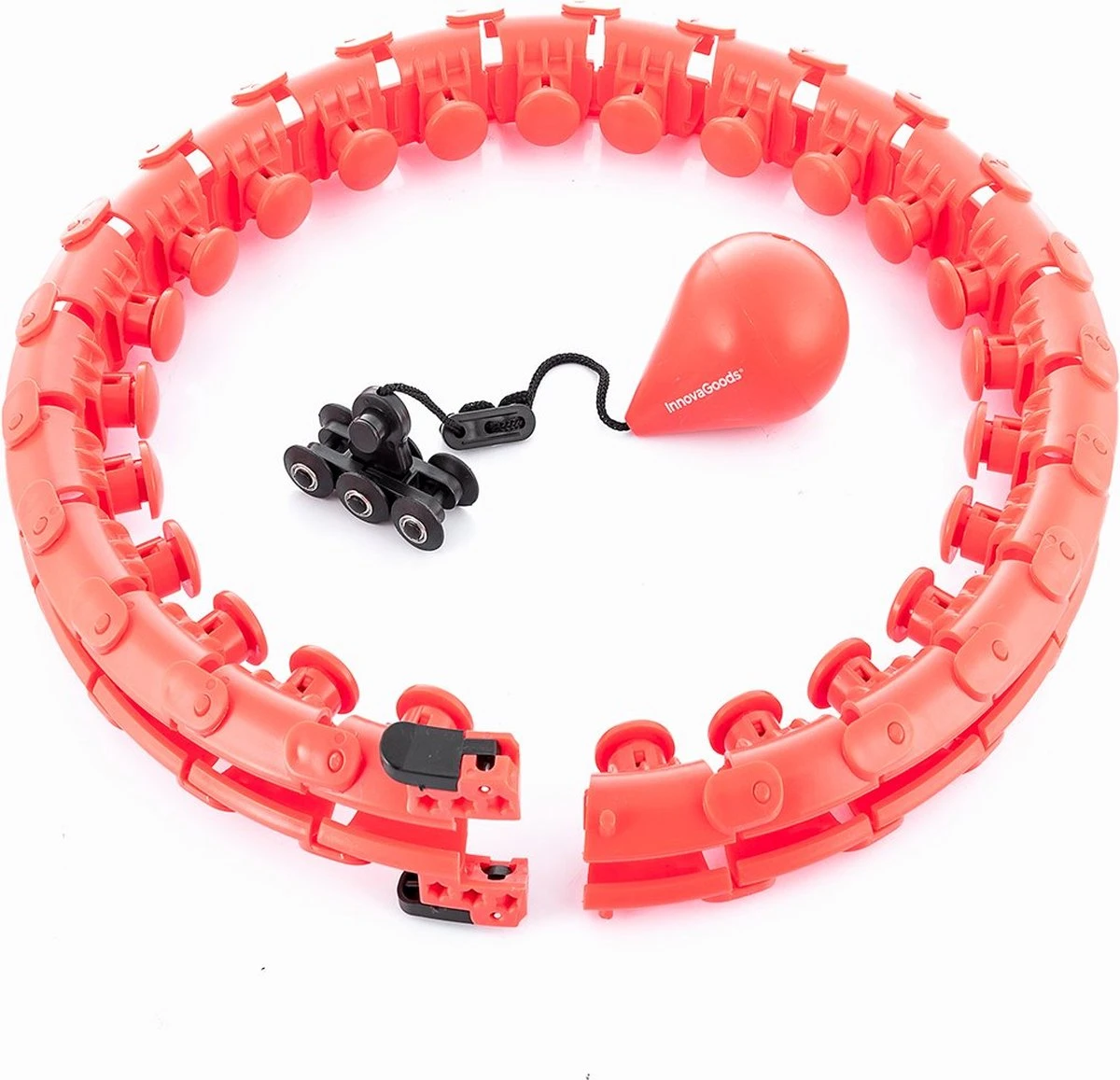 Een aanpasbare slimme fitnesshoepel met gewicht die ideaal is voor training en om uw figuur eenvoudig en geheel comfortabel in vorm te krijgen, waarmee u vele voordelen behaalt. Deze robuuste fitnesshoepel met ballast is ergonomisch en multifunctioneel, aangezien u er tegelijkertijd mee kunt trainen en uw middel kunt masseren. Perfect voor het versterken en verstevigen van lichaamsspieren door thuis sport te beoefenen. Hij past aan het middel en is afneembaar, bestaat uit 24 delen die eenvoudig kunnen worden gemonteerd en demonteerd voor het gewenste formaat. Hij heeft een connector met veiligheidspal en interne veren met flexibele pads die zorgen voor een stevige grip, en die de impact van de kracht van de draai absorberen en zorgen voor een 360º massage-effect. Hij bevat een ballastaccessoire (280g gewicht) met katrol en aanpasbaar koord om de lengte naar wens aan te passen. Dit type hoepel (automatisch draaiend) is eenvoudiger te gebruiken dan andere gangbare hoepels en is sterk aanbevolen voor beginners aangezien hij niet valt tijdens gebruik, en de snelheid stapsgewijs kan worden verhoogd om sneller meer calorieën te verbranden. Hij neemt ook weinig ruimte in wanneer hij uit elkaar wordt gehaald, waarmee hij eenvoudiger mee te nemen en op te bergen is.