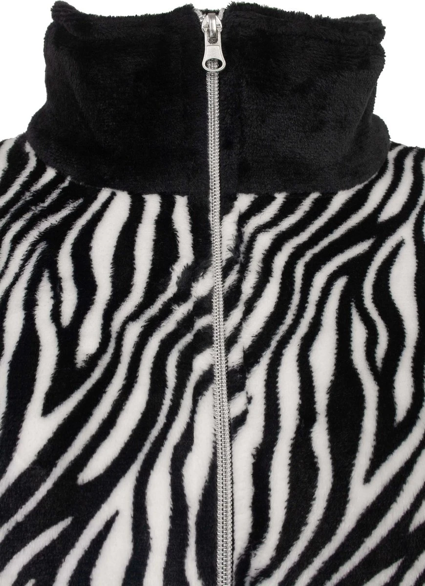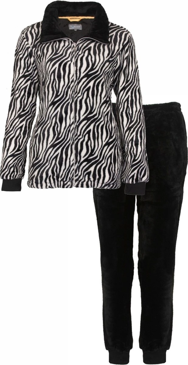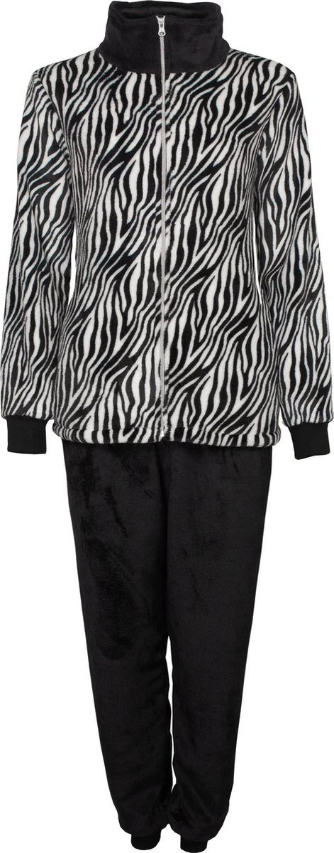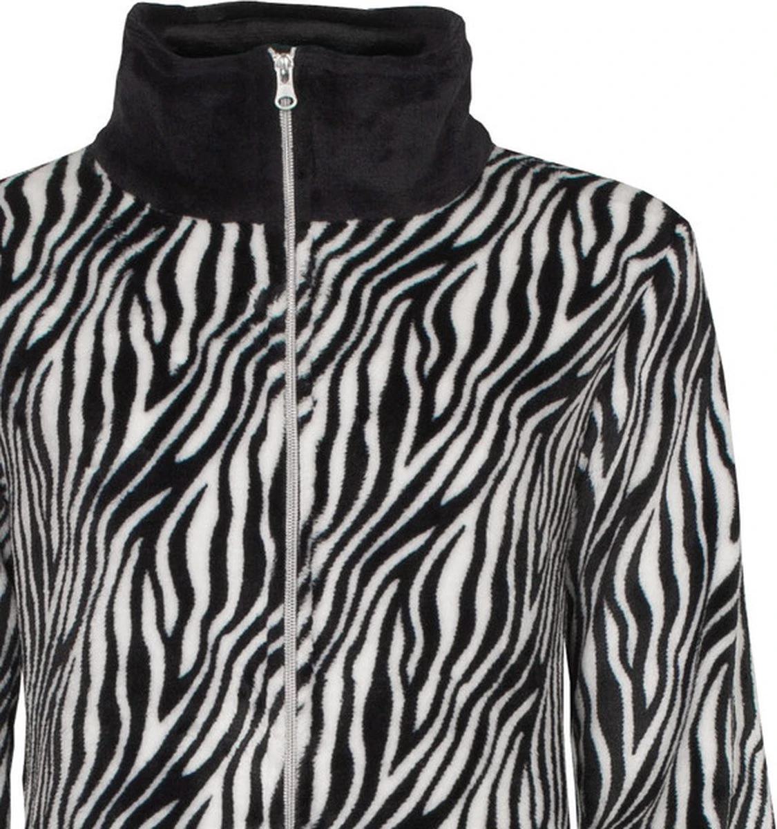 Irresistible dames huispak gemaakt van Coral Fleece 100 % Polyester. Dit huispak is heerlijk om in weg te dromen thuis of warm ingepakt de hond buiten te laten. De zebra dessin top is gemaakt van warme Coral fleece die heerlijk zacht aanvoelt. De top heeft Lange mouwen met boorden en een opstaande kraag die ook plat gedragen kan worden, ook heeft de top een deelbare rits en niet te vergeten zakken in de zijnaad. De Lange unie zwarte broek heeft zakken in de zijnaad en boorden aan de enkels