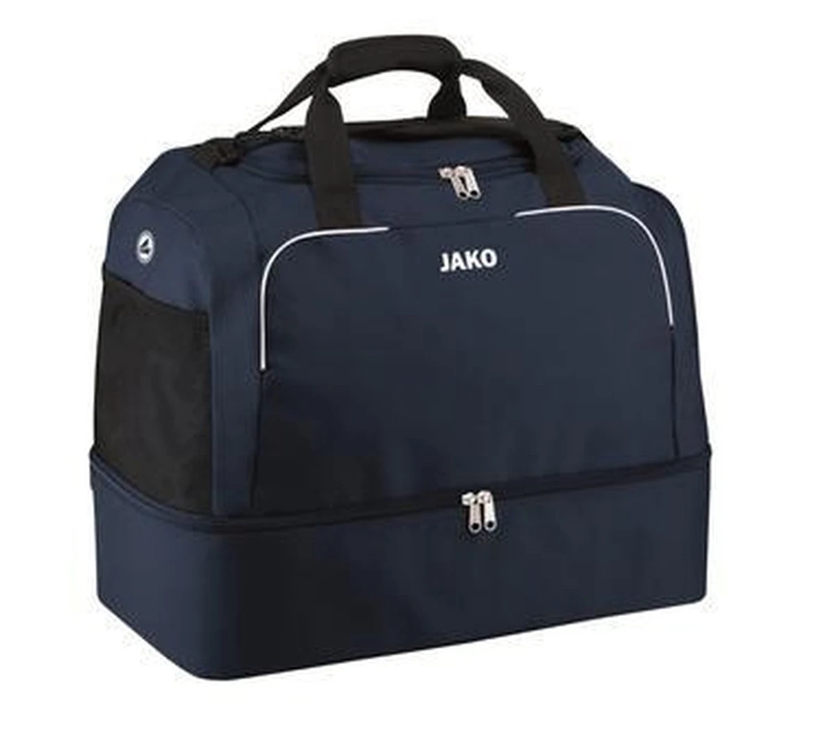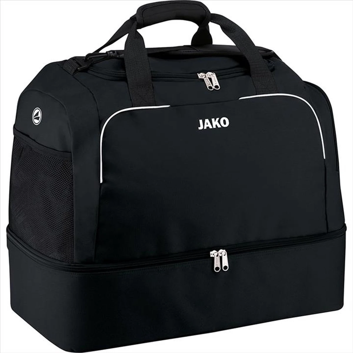 Jako Sporttas Classico met Bodemvak Bambini. Jako voetbaltassen met een extra diep vak aan de zijkant om natgoed te scheiden van droge kleding. Aan de onderzijde van deze Jako sporttas is een separaat bodemvak gemaakt met voldoende plek voor schoenen. Jako Sporttas Classico met Bodemvak Bambini bestellen in de kleuren rood, royal, sport groen, zwart en marine.