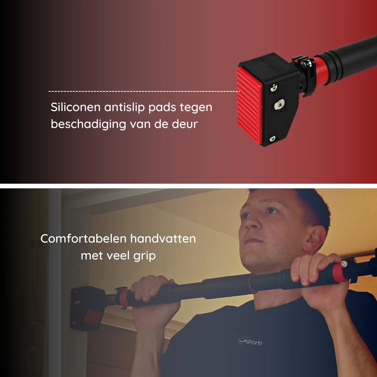 Wil jij vanuit huis trainen, maar geen pull up bar in de muur schroeven of ben je bang dat een standaard pull up bar je deurkozijn beschadigd? Dan is de JPS Sports® Pull up bar perfect voor jou. Deze optrekstang kun je zonder schroeven tussen je deur bevestigen en na je training weer makkelijk los draaien. De pull up bar neemt vervolgens geen ruimte in bij het opbergen. Ideaal voor een home gym!