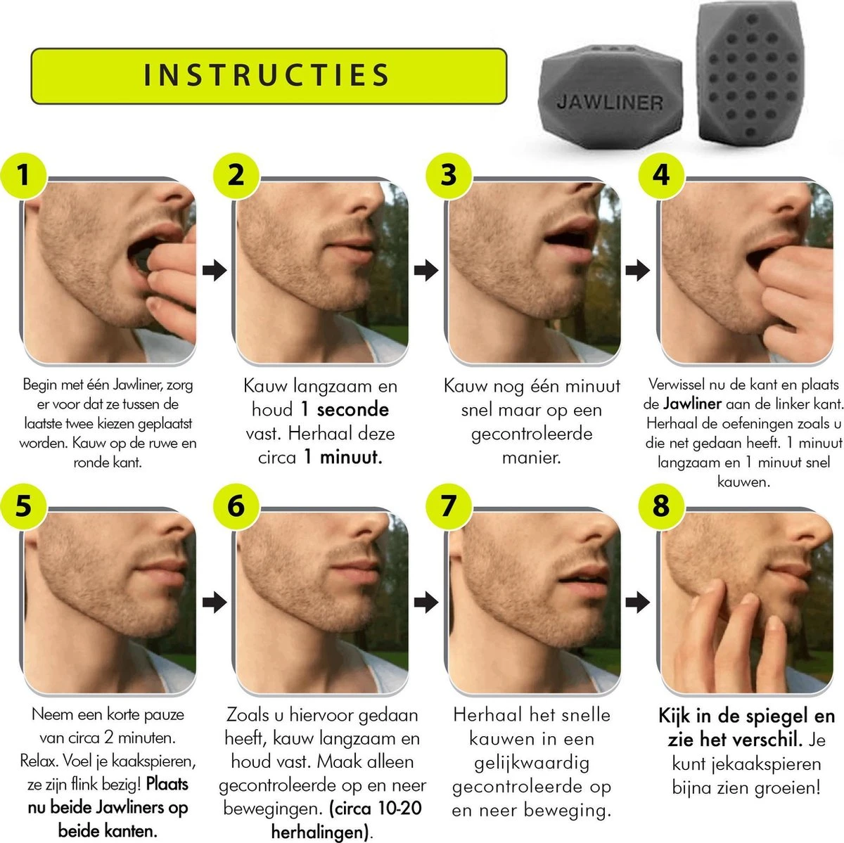 Let op: Orthodontisten raden ten strengste aan om niet meer dan 10-20 minuten om de dag de kaaklijn te trainen.