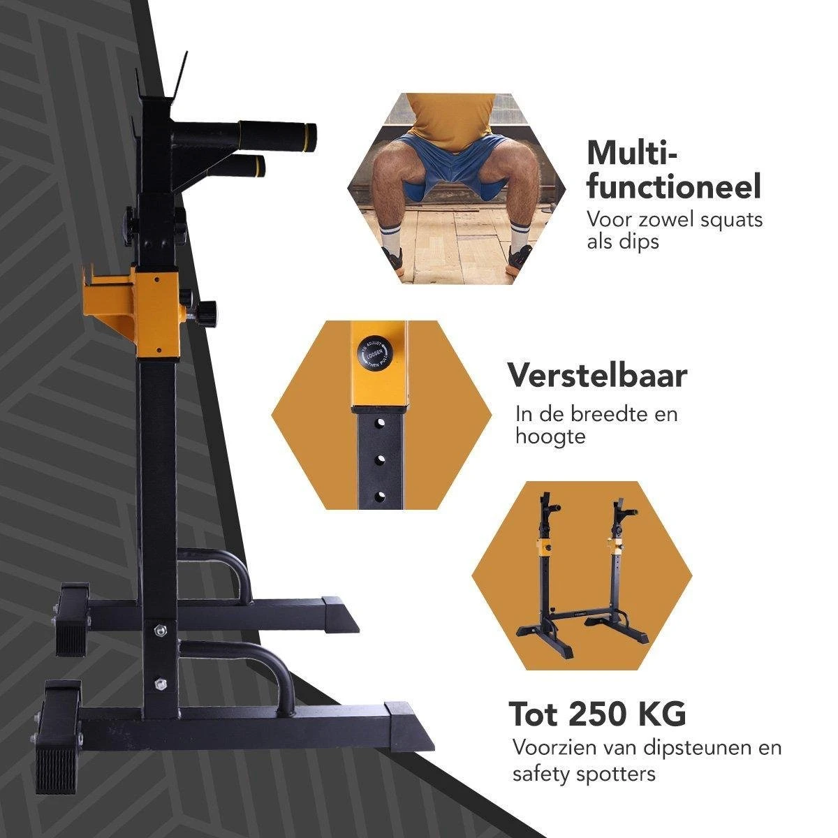 Doe jij liever workouts vanuit huis en wil je dit professioneel oppakken? Dankzij de KIMO DIRECT Squat Rek breng je de sportschool in huis. Zo kun je thuis direct van start met je workout. Het multifunctionele squat rack is kwalitatief sterk en past in iedere gym. Het squatrek is verstelbaar in 9 standen en belastbaar tot wel 300kg, kortom een must-have fitness apparaat!