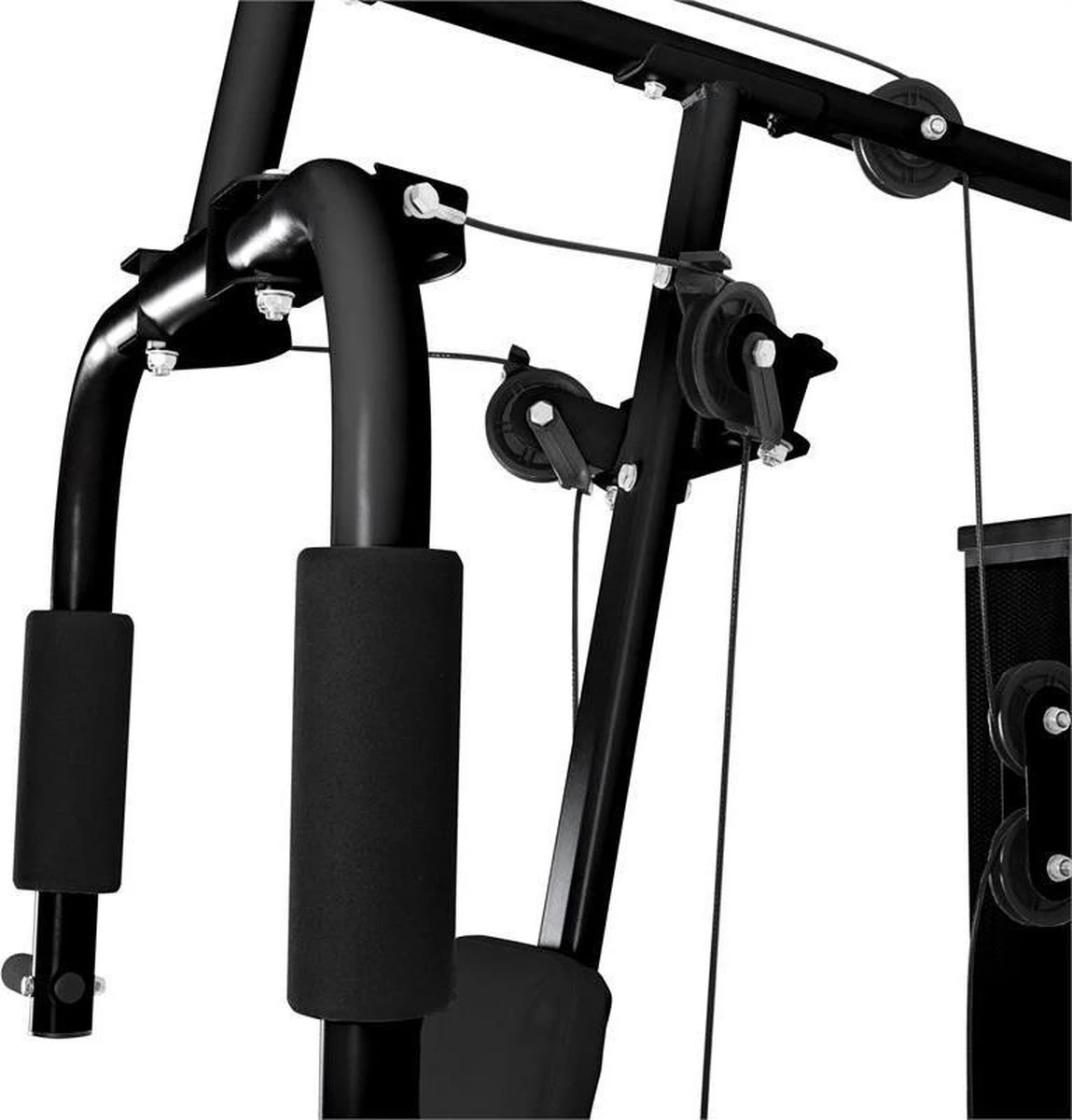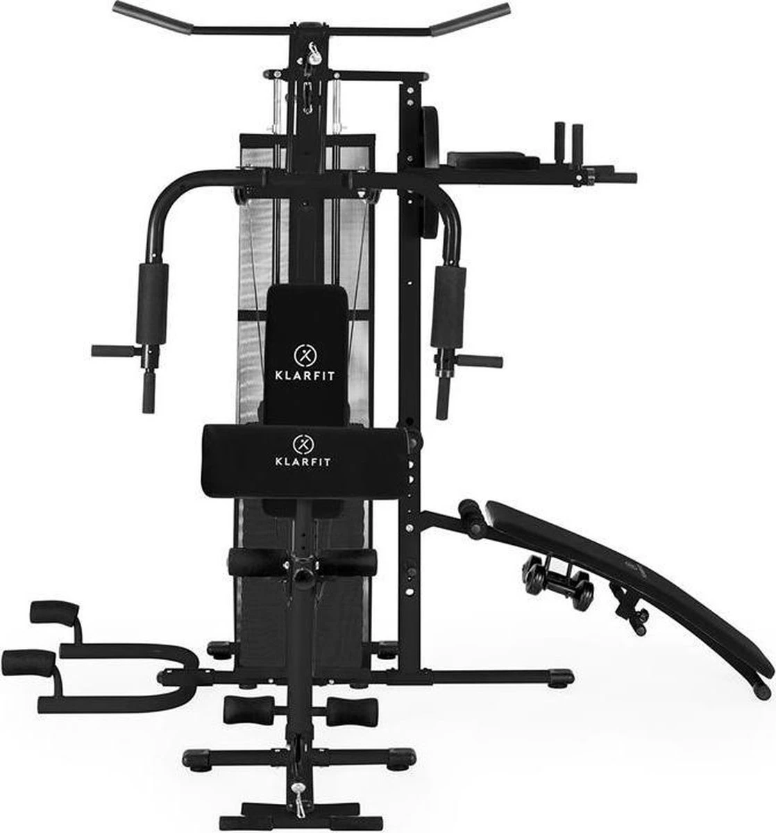 De Ultimate Gym 5000 van KLARFIT is een multifunctioneel Krachttraining Station, dat u bij uw dagelijkse training onder de armen grijpt en een gewrichtsontziende uitvoering van de oefeningen mogelijk maakt.Het robuuste beklede buizenframe maak meer dan 50 oefeningen mogelijk voor een holistische training van het gehele lichaam. Het apparaat biedt daarmee de meest veelzijdige mogelijkheden voor workouts bij uw privé fitness. Lichtlopende kabelkatrollen garanderen een gelijkmatige beweging bij optimale krachtoverbrenging.Vanaf de zitplaats in het midden kunt u de Butterfly-module bereiken, die ook gebruikt kan worden bij het bankdrukken alsook bij borst- en schoudertraining. Het toestel voor beenstrekoefeningen kan gebruikt worden voor de beenmusculatuur aan de voorkant en de brede bovenste trekstang voor biceps, triceps, latissimus- en rug-oefeningen.De kabelkatrol is geschikt voor staande biceps-, triceps- en rugtraining, een zittende roeitraining voor schouders, rug en armen of ook beenbuig-oefeningen, wanneer de meegeleverde beenlussen aangebracht zijn. Het beenbuigtoestel is ruggelings voor de achterste beenpartij en bips te gebruiken.Aan de rechter kant bevindt zich een schuine cruchbank voor buikoefeningen alsook een steunmodule voor beenheffingen en hangende trekoefeningen. Het steuntoestel op de grond aan de linker kant is bovendien optimaal voor verschillende opdrukvariaties.De leuningen en zitkussens beschikken over een gemakkelijk schoon te maken kunstlederen bekleding en zijn daarvoor eenvoudig na de training met een doek schoon te vegen.