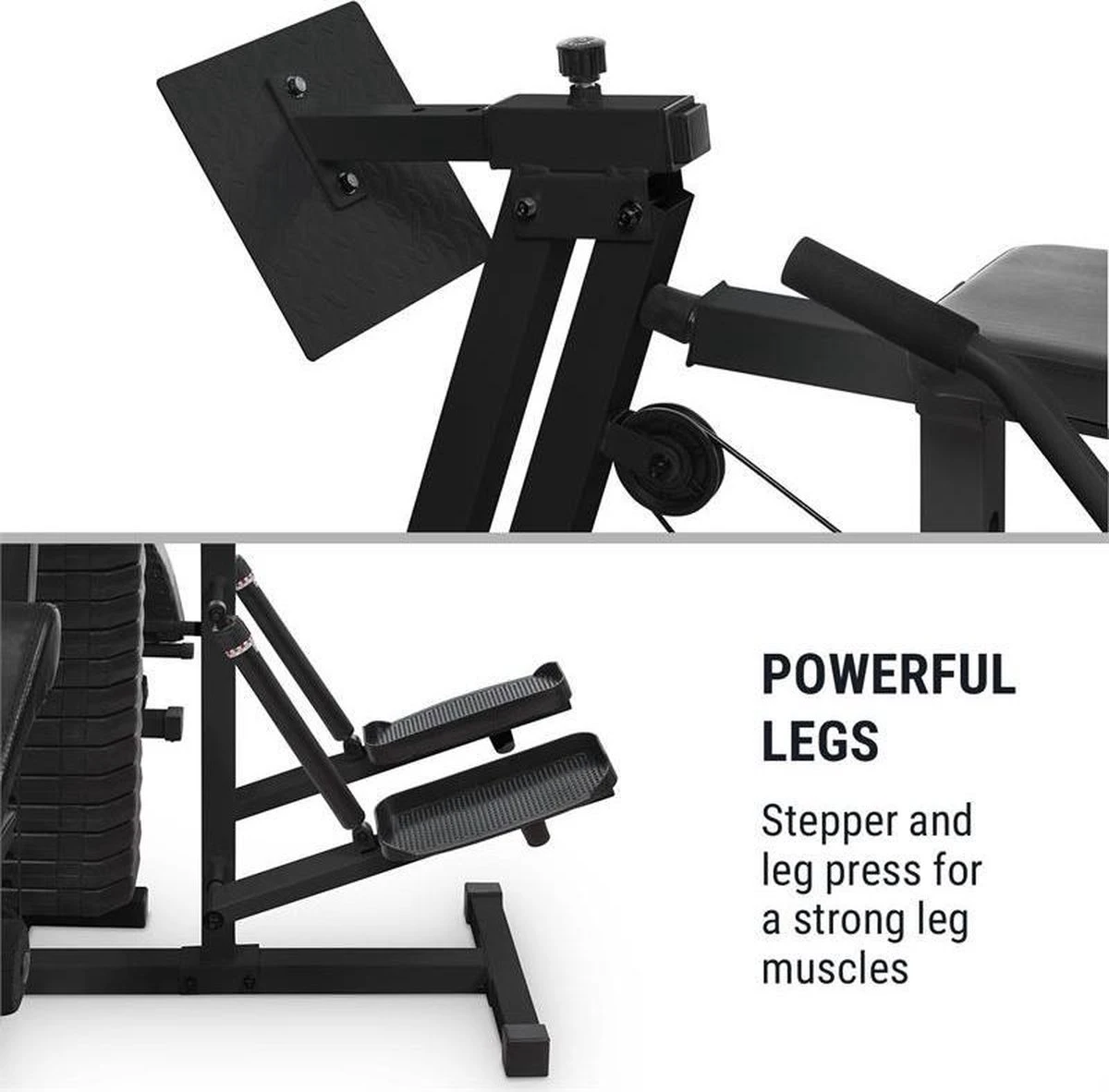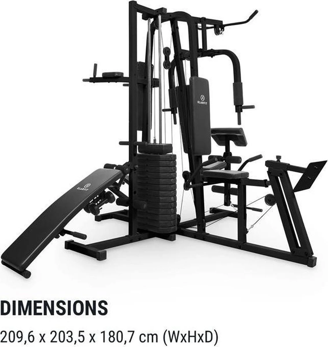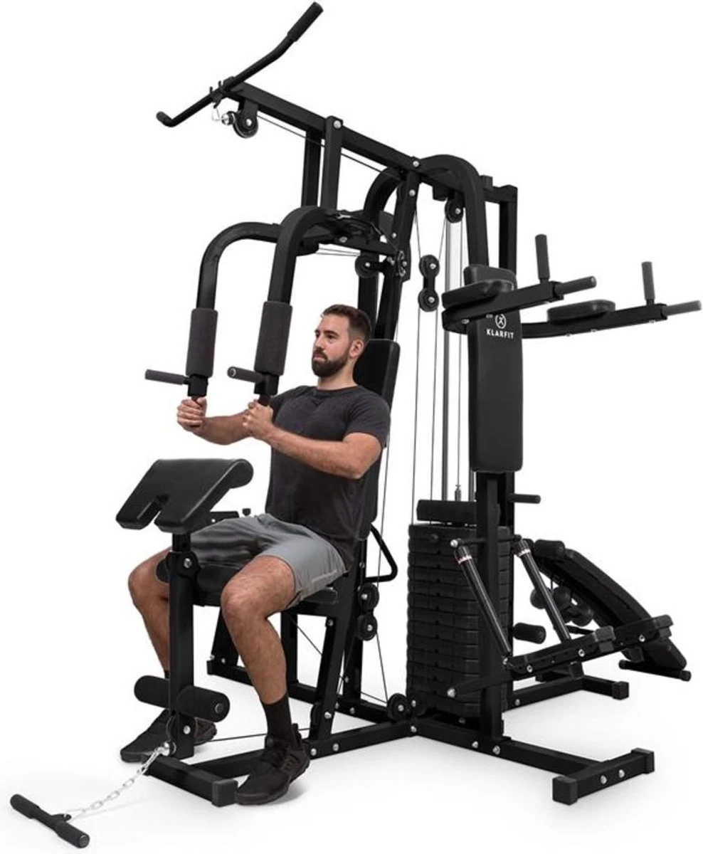 Het multifunctionele KLARFIT Ultimate Gym 9000 krachtrainingstation neemt je tijdens de dagelijks training bij de arm en maakt binnen de eigen vier muren een gewrichtsontziende uitvoering van al je oefeningen mogelijk.Het robuuste frame van gecoat, gezandstraald kwaliteitsstaal maakt meer dan 100 verschillende oefeningen voor het hele lichaam mogelijk. Het Ultimate Gym 9000 trainingsapparaat wordt met 100 kg aan gewichten geleverd, die in stappen van 7 kg kunnen worden gestapeld, zodat je gelijk van start kunt gaan. Soepele kabels garanderen daarbij op elk moment een gelijkmatige beweging en een geoptimaliseerde krachtoverdracht.Vanaf de zitting van het krachtstation heeft u toegang tot het borststation dat je ook voor bankdrukken kunt gebruiken. Met de beenpers train je effectief je voorste beenspieren. De lat pull is uitstekend voor biceps, triceps en rugoefeningen. Maar dat is nog niet alles: Op de negatieve bank kun je daarnaast oefeningen voor benen en buik uitvoeren. Een dip tower en stepper ronden het trainingsaanbod af. De kwalitatief hoogwaardige, gestructureerde bekleding biedt je tijdens het gebruik een maximum aan comfort en is na gebruik moeiteloos te reinigen.Je traint liever samen? De Ultimate Gym 9000 van KLARFIT is zo slim geconstrueerd dat je er met twee tegelijk aan kunt trainen.Het complete trainingsstation voor al je spiergroepen: de Ultimate Gym 9000 van KLARFIT.