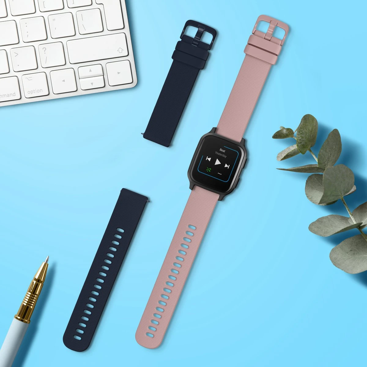 - BLIKVANGER: Met de reserveset van horlogebandjes in de kleur donkerblauw / oudroze kun je de look van je smartwatch naar wens veranderen. Zo wordt jouw horloge een echte blikvanger.
